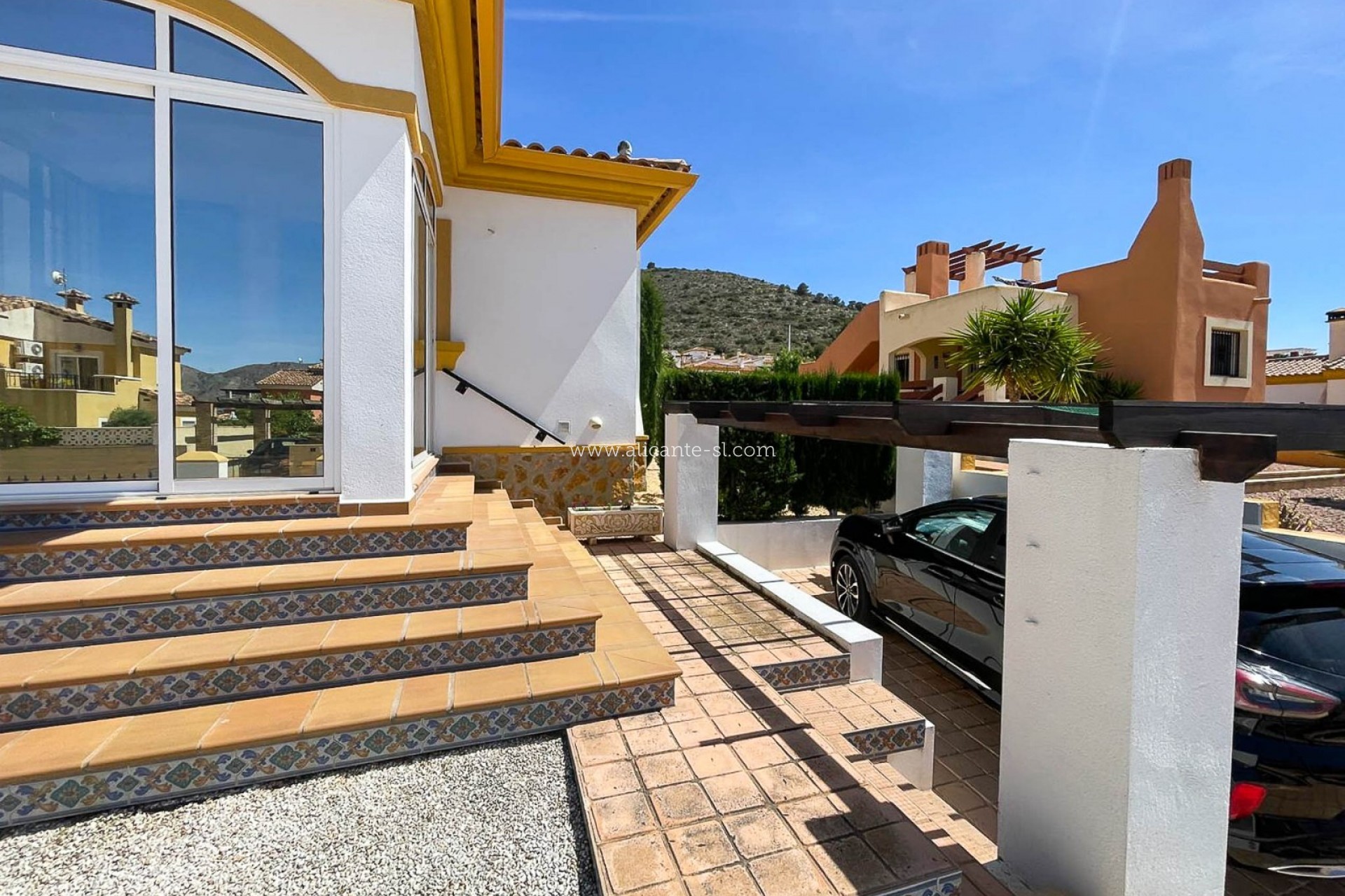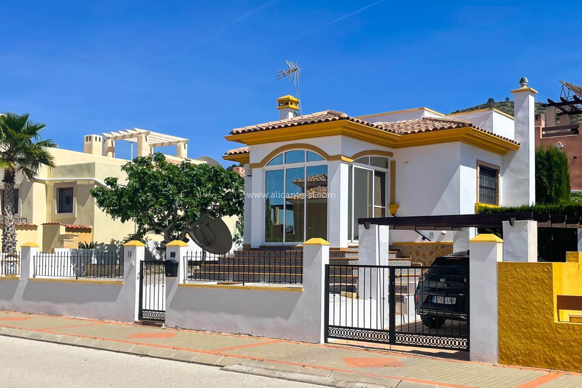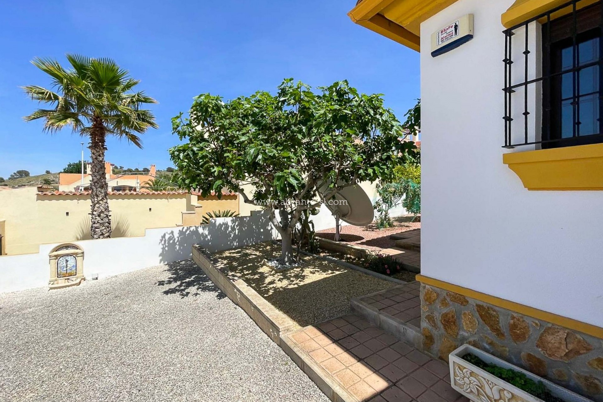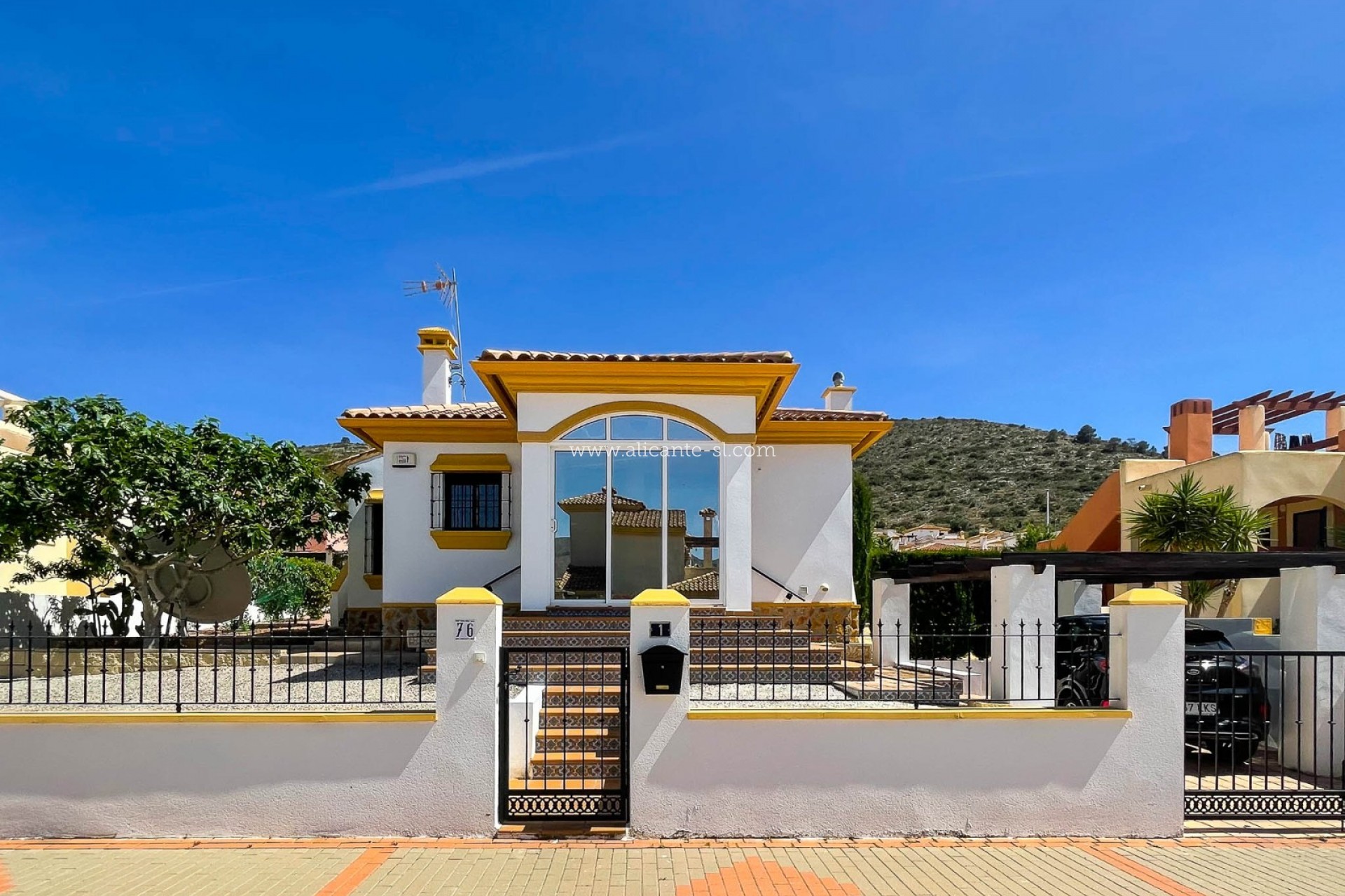Draußen gibt es Fahrzeugeingangstore, die auf eine private Auffahrt mit Carport führen, einen großen, gut gepflegten Garten hinter dem Haus mit einer Reihe von Pflanzen und Obstbäumen, darunter; Apfel, Mandarine, Feige, Zitrone, Kirsche, Birne und Kumquat ... Es gibt auch eine große Dachterrasse mit schöner Aussicht über das Hondon-Tal.