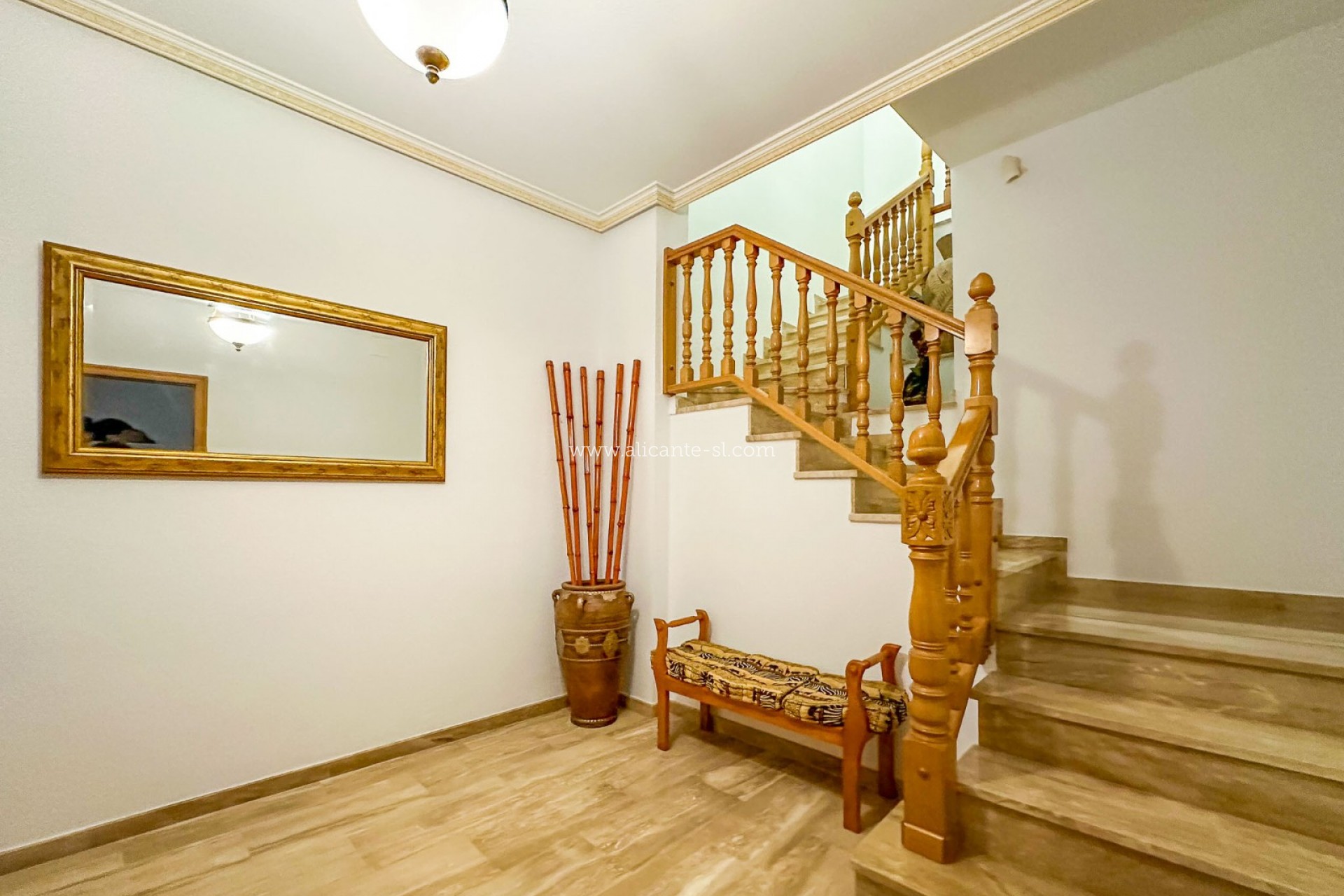 Eine Treppe führt vom großen Eingangsbereich in die erste Etage, wo Sie ein geräumiges Wohnzimmer mit Kamin, eine Wohnküche, 3 geräumige Schlafzimmer und 2 Badezimmer finden. Eines der Badezimmer ist ein en-suite Badezimmer im Hauptschlafzimmer. Außerdem gibt es einen Innenhof, der von der Küche aus zugänglich ist.