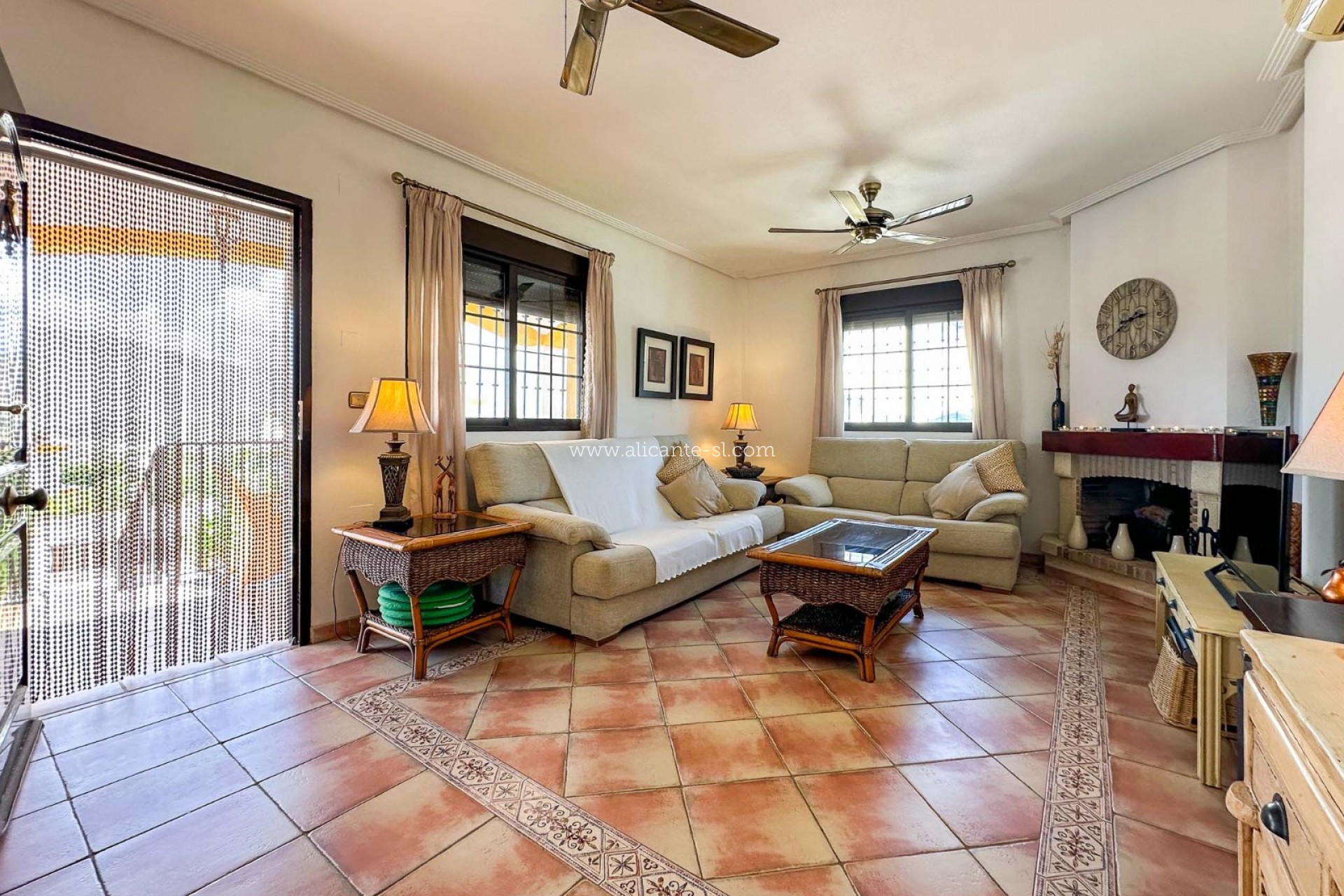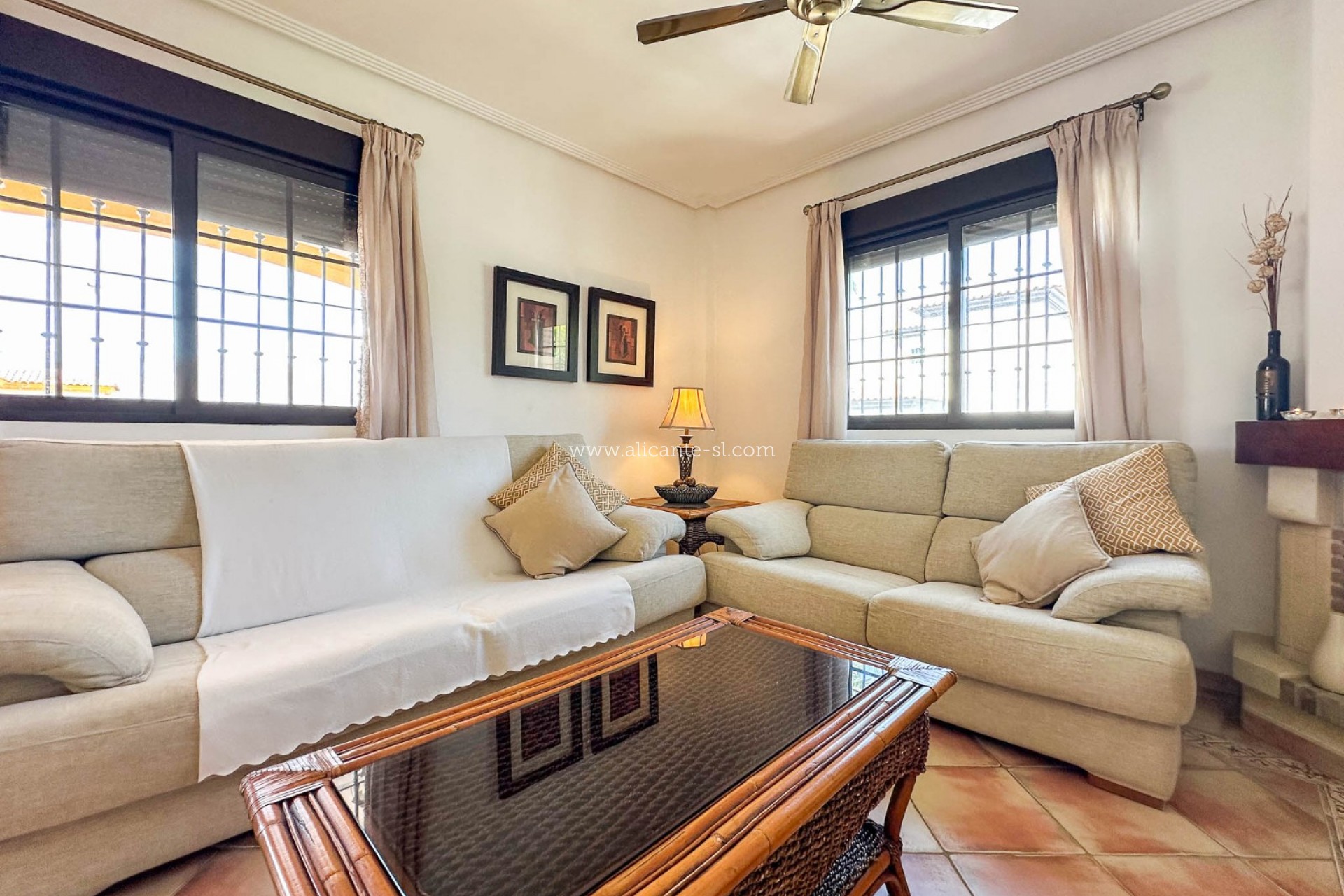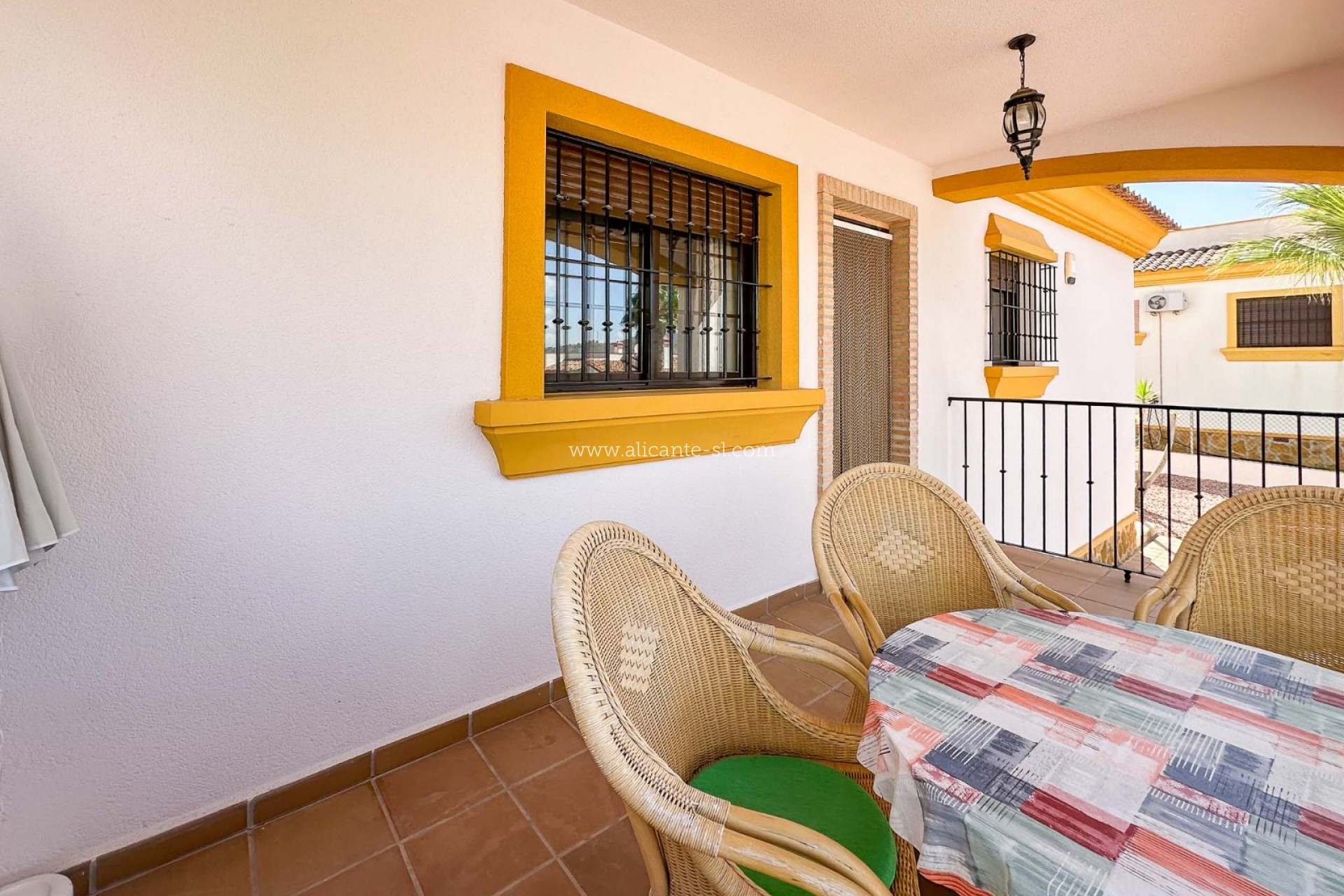 Diese makellos gepflegte Villa verfügt über 3 Schlafzimmer, 2 Badezimmer (Hauptschlafzimmer mit Bad en suite), ein großes Wohnzimmer, eine voll ausgestattete Küche und eine überdachte Terrasse an der Vorderseite mit Blick auf den Garten und den Poolbereich.