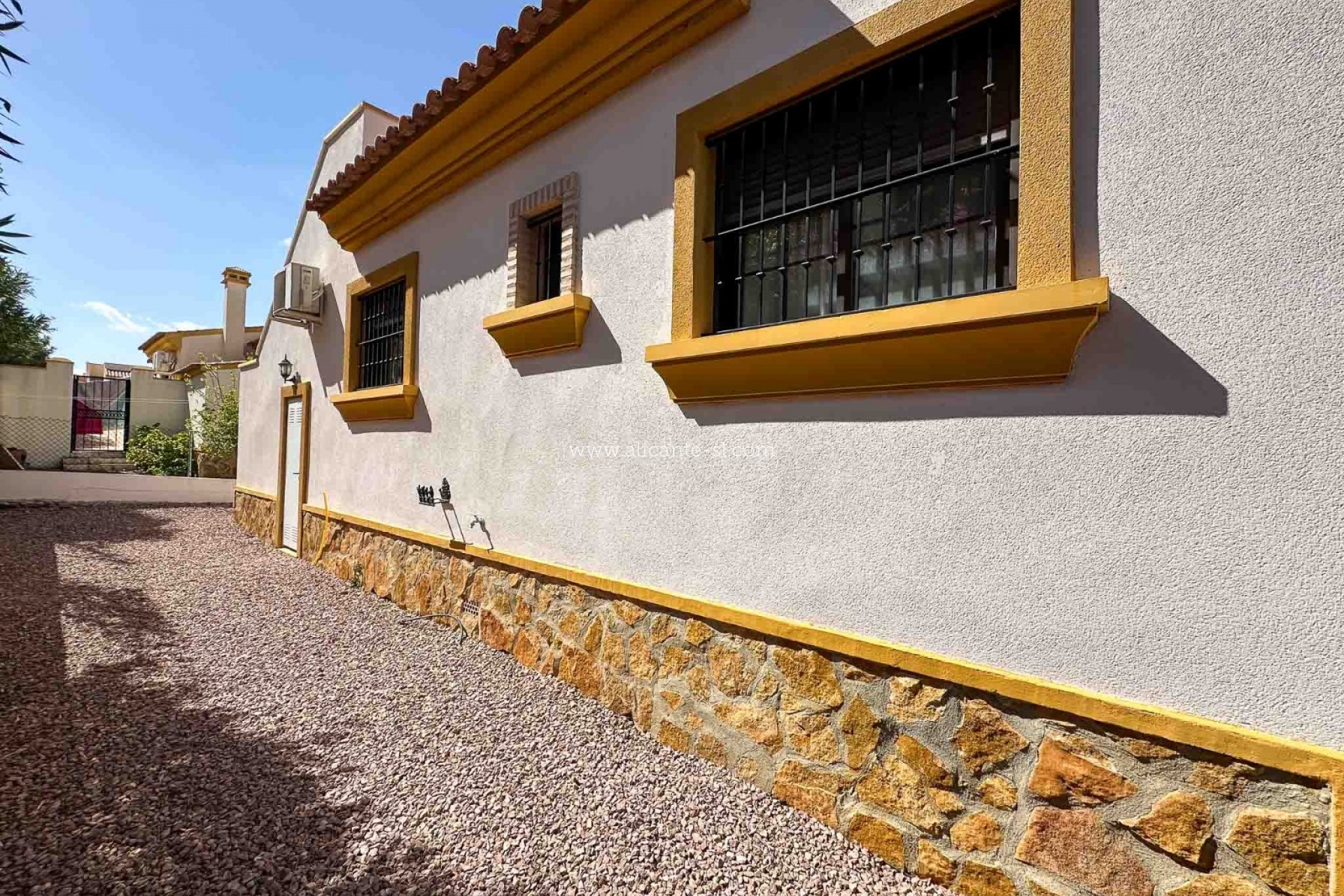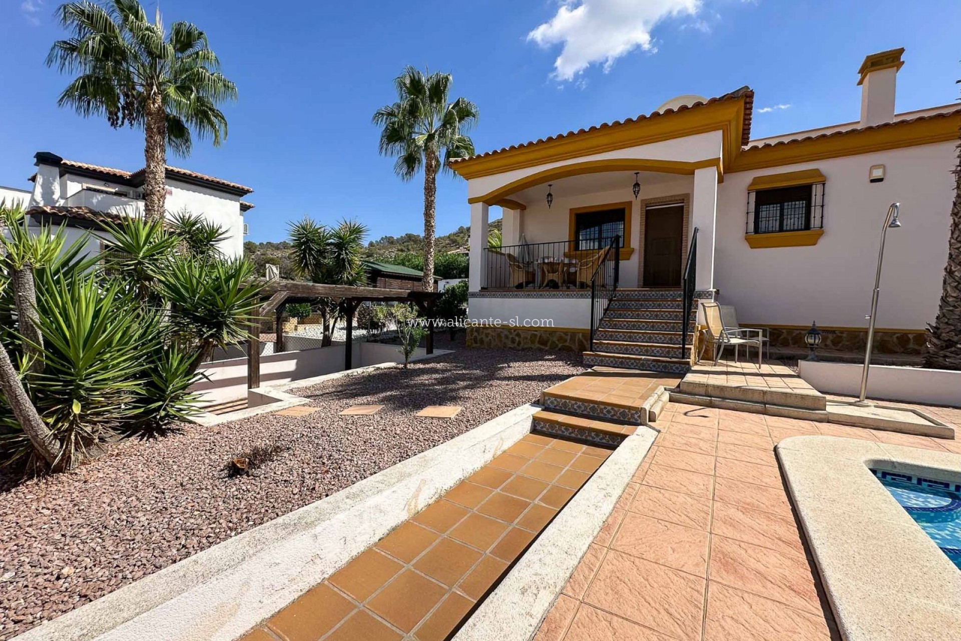 Im Außenbereich befindet sich ein privater Pool (8x4 m) mit Sonnenterrasse und Sitzgelegenheiten. Ein Einfahrtstor führt zu einer privaten Auffahrt mit Carport. Der gepflegte Garten ist mit zahlreichen Pflanzen, Bäumen und Palmen angelegt. Zudem gibt es eine großzügige Dachterrasse mit herrlichem Blick über das Hondón-Tal und die umliegenden Berge. Die Immobilie liegt außerdem in einer ruhigen Sackgasse und bietet dadurch eine besonders friedliche Wohnlage.