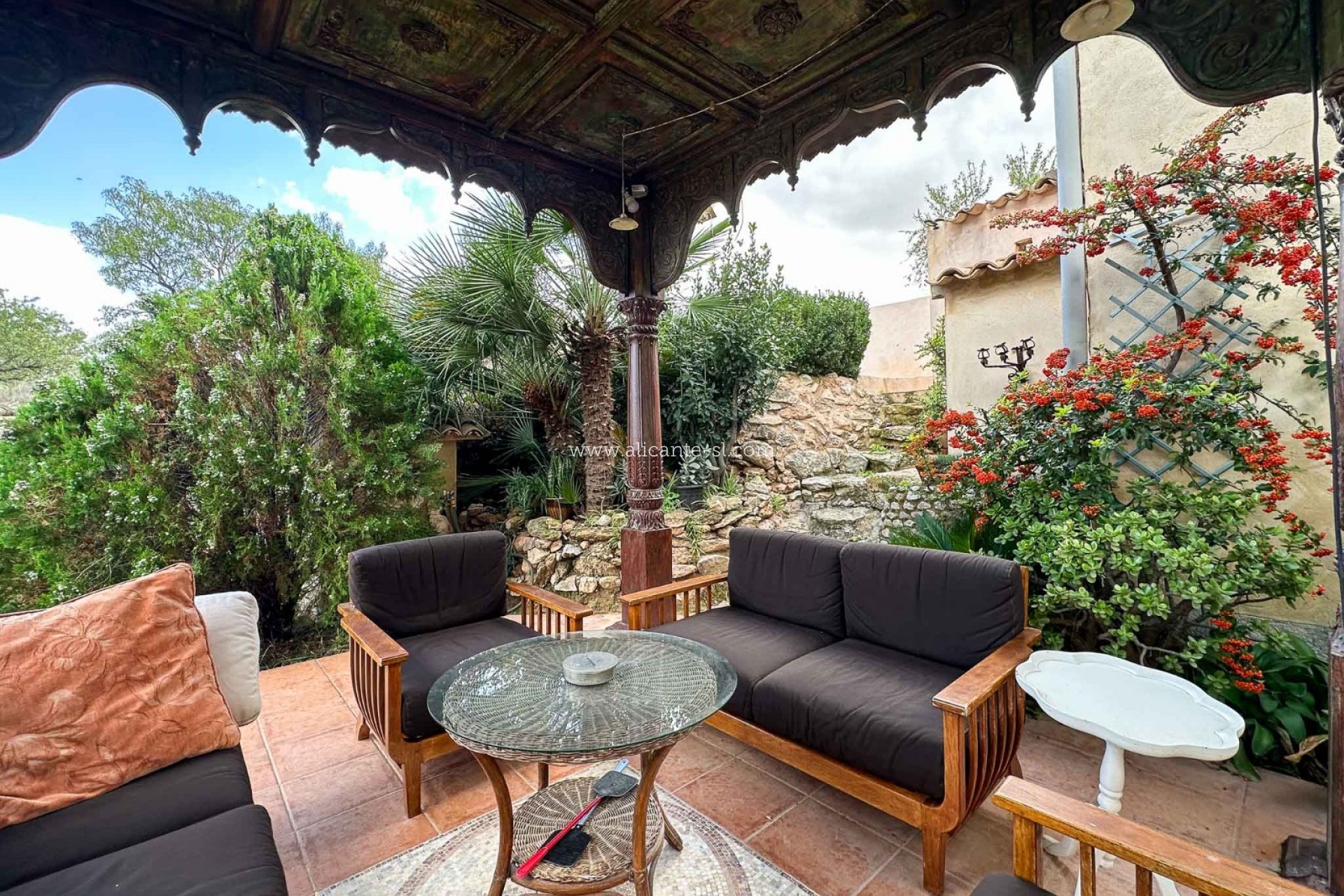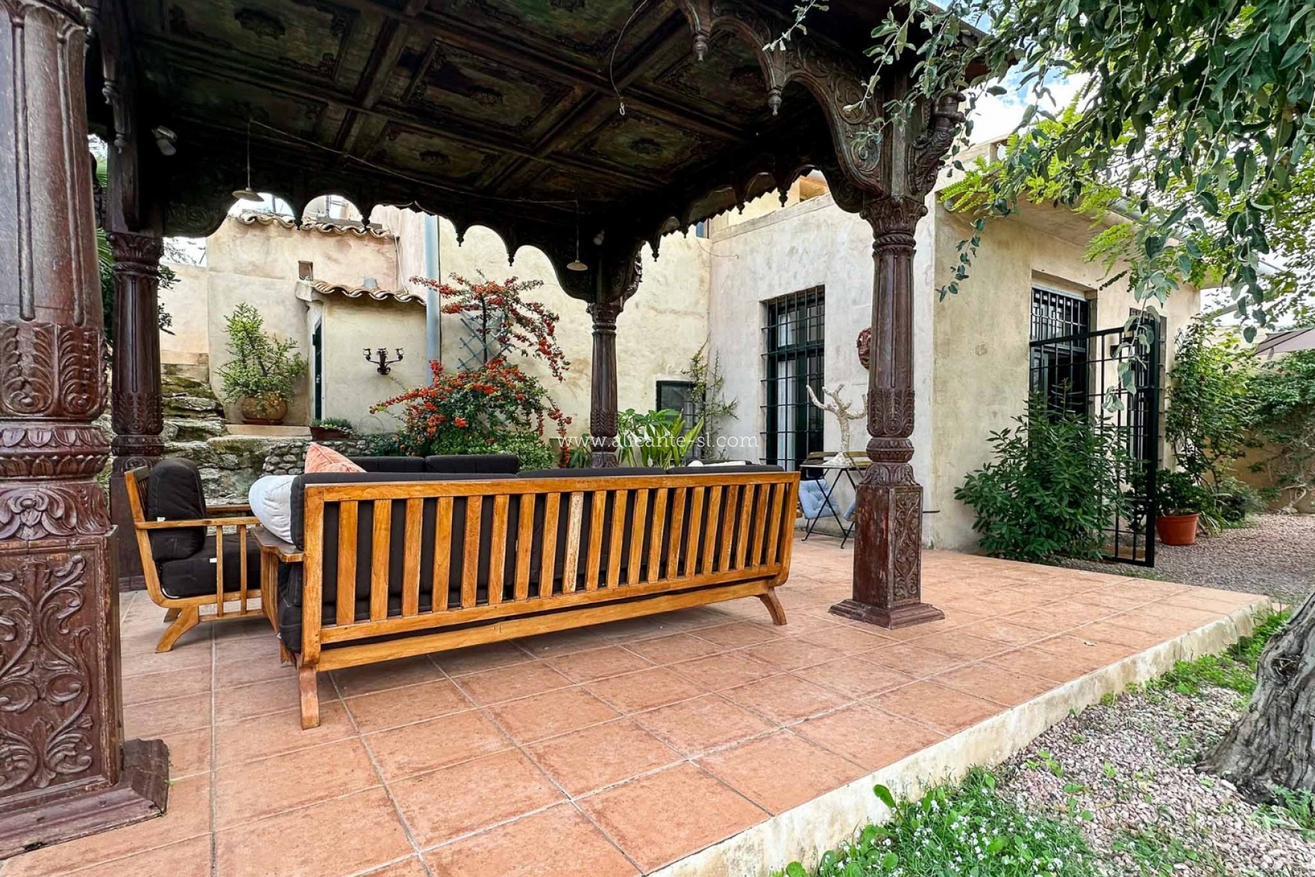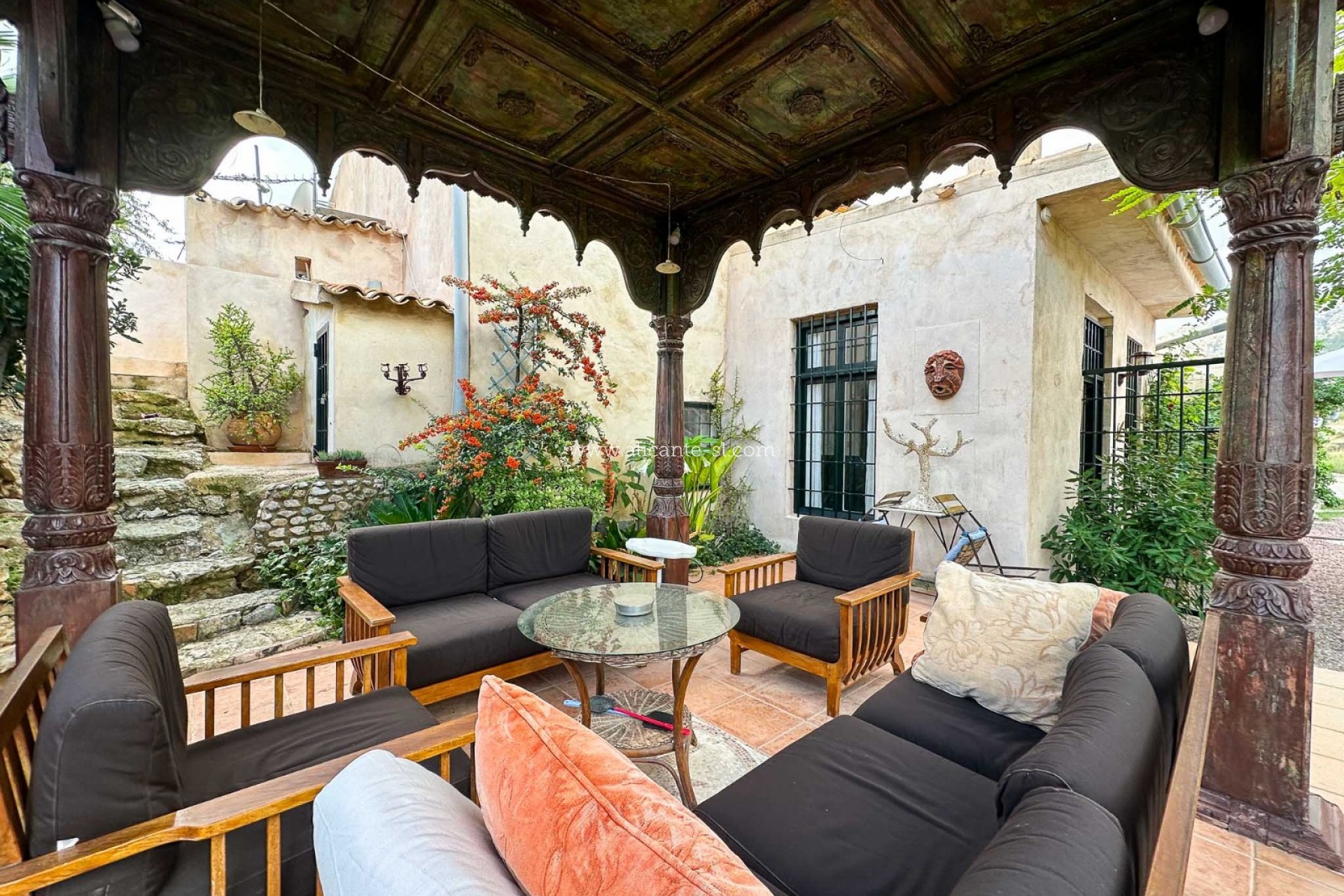 Das Anwesen beeindruckt sofort mit seiner traditionellen Fassade, dem privaten Eingang und den einladenden Außenbereichen, die von üppigem Grün umrahmt sind. Im Inneren vermittelt die Kombination aus Terrakottaböden, Holzbalken und sanften Rundungen ein zeitlos warmes und authentisches Ambiente.