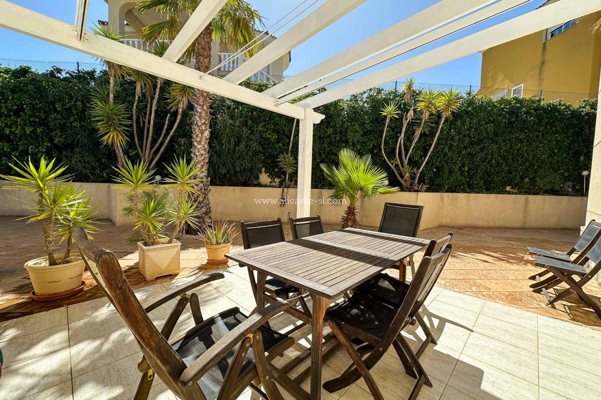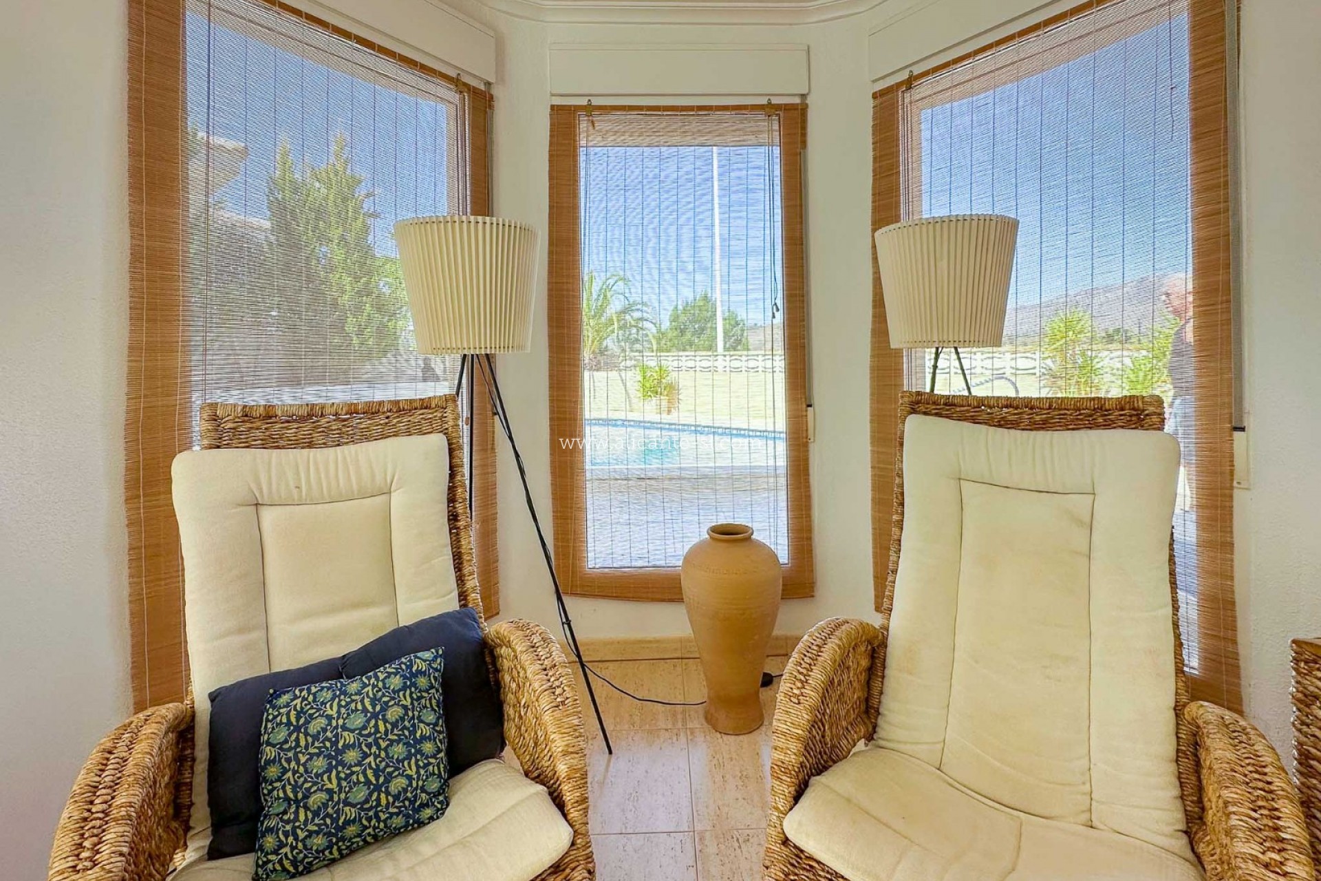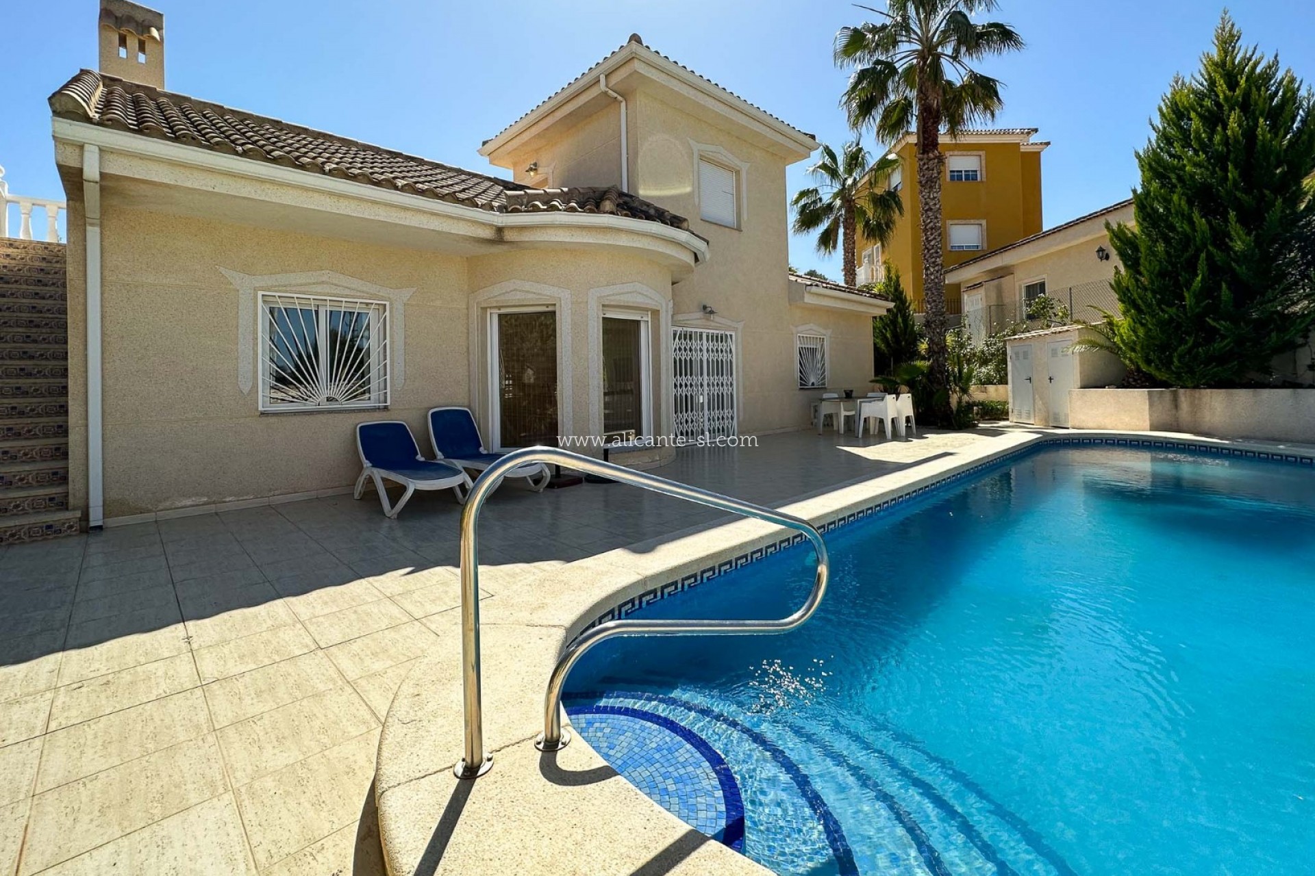 Esta villa impecablemente presentada se distribuye en 2 plantas. En la planta baja hay un gran salón/comedor, cocina totalmente equipada, 3 dormitorios, 2 baños (1 principal en suite), vestíbulo de entrada y salón acristalado con vistas al jardín y la piscina.