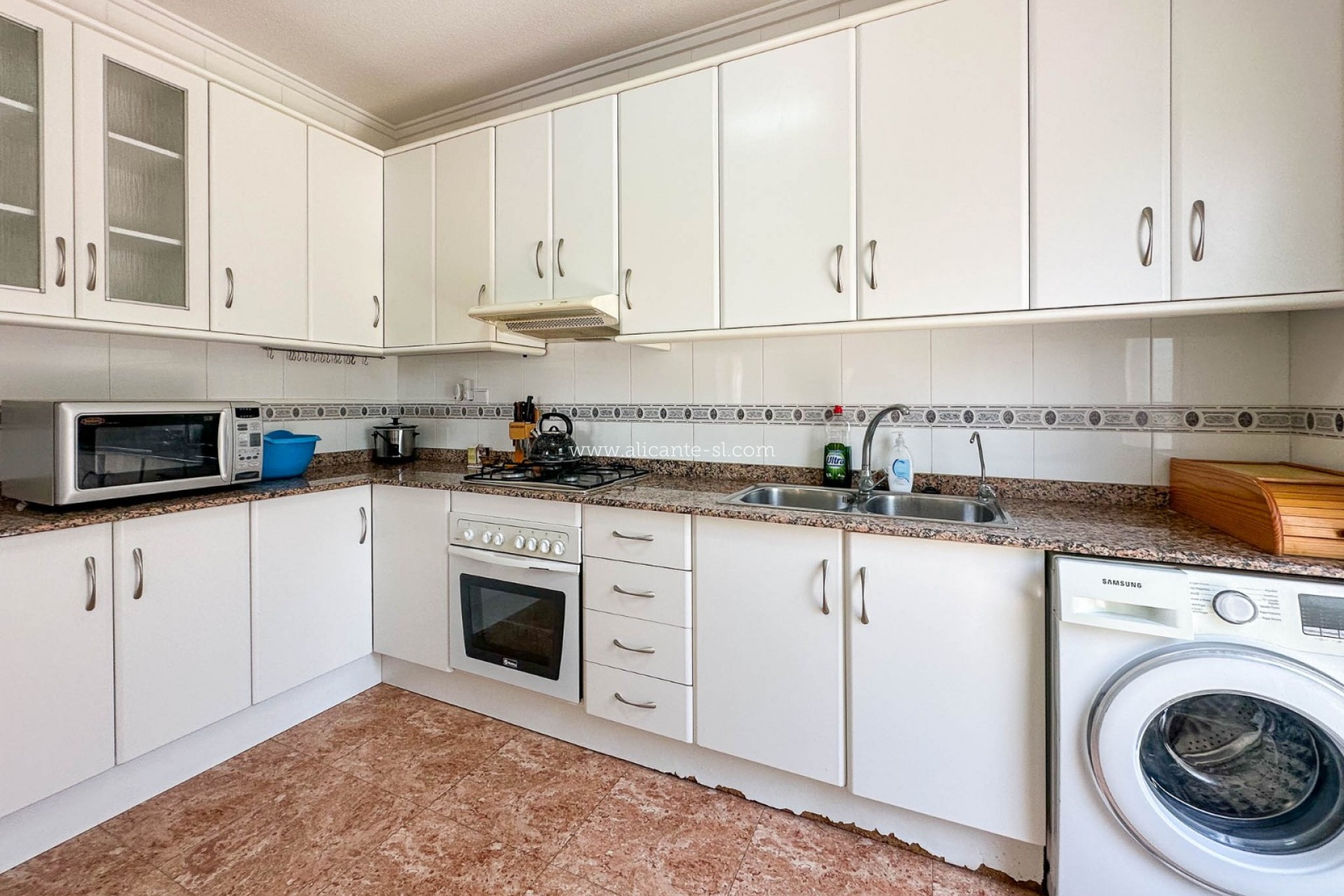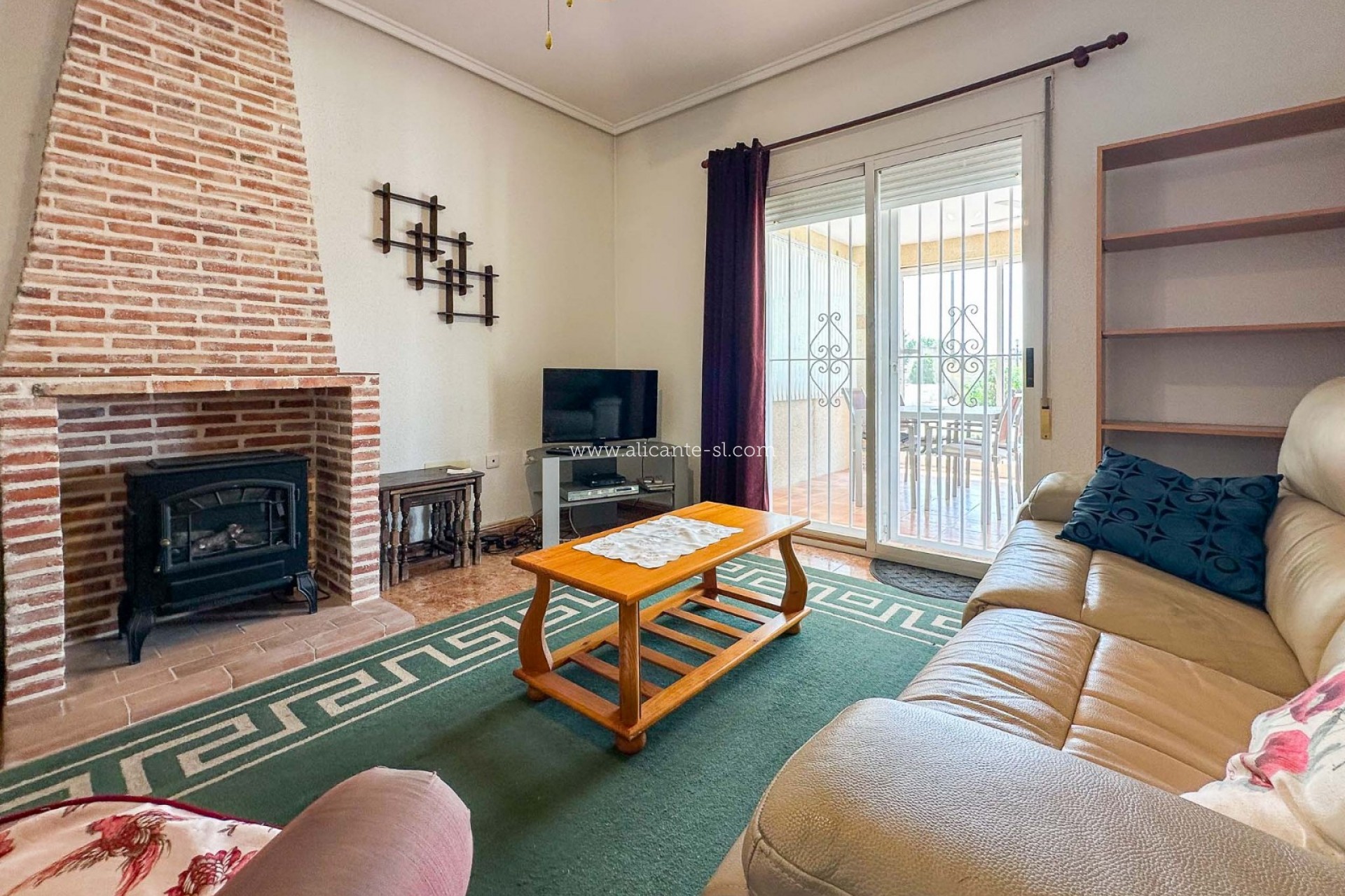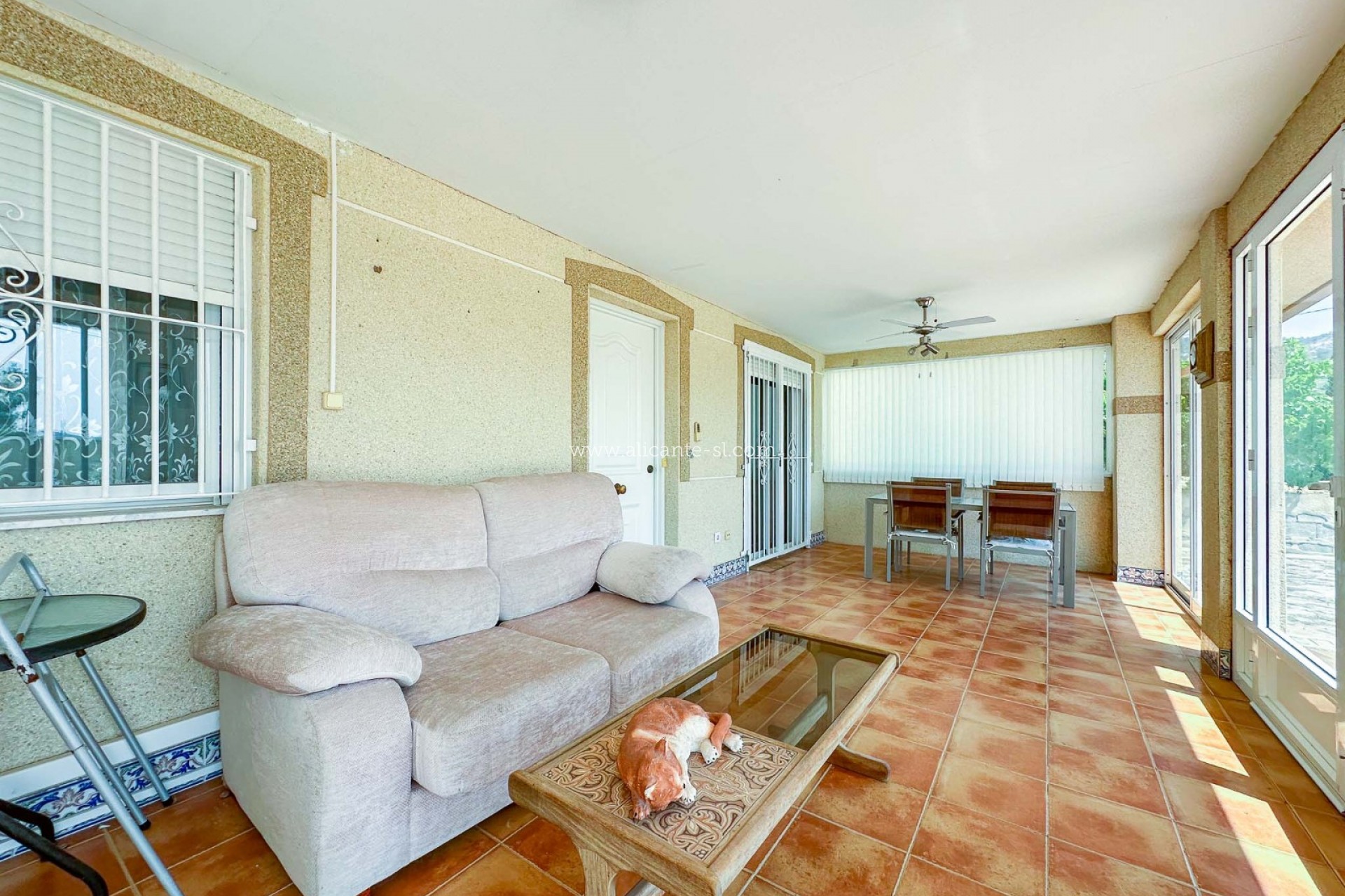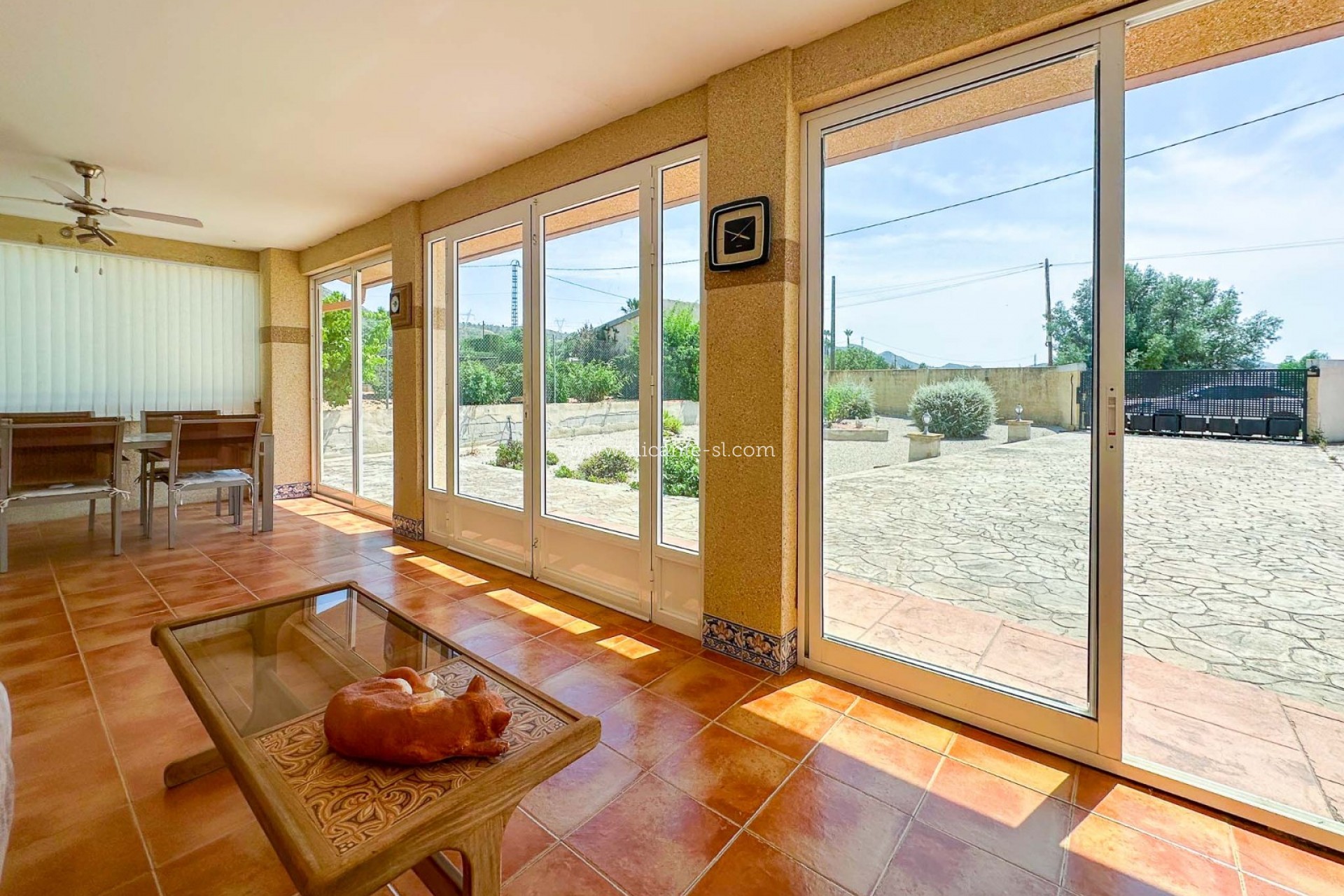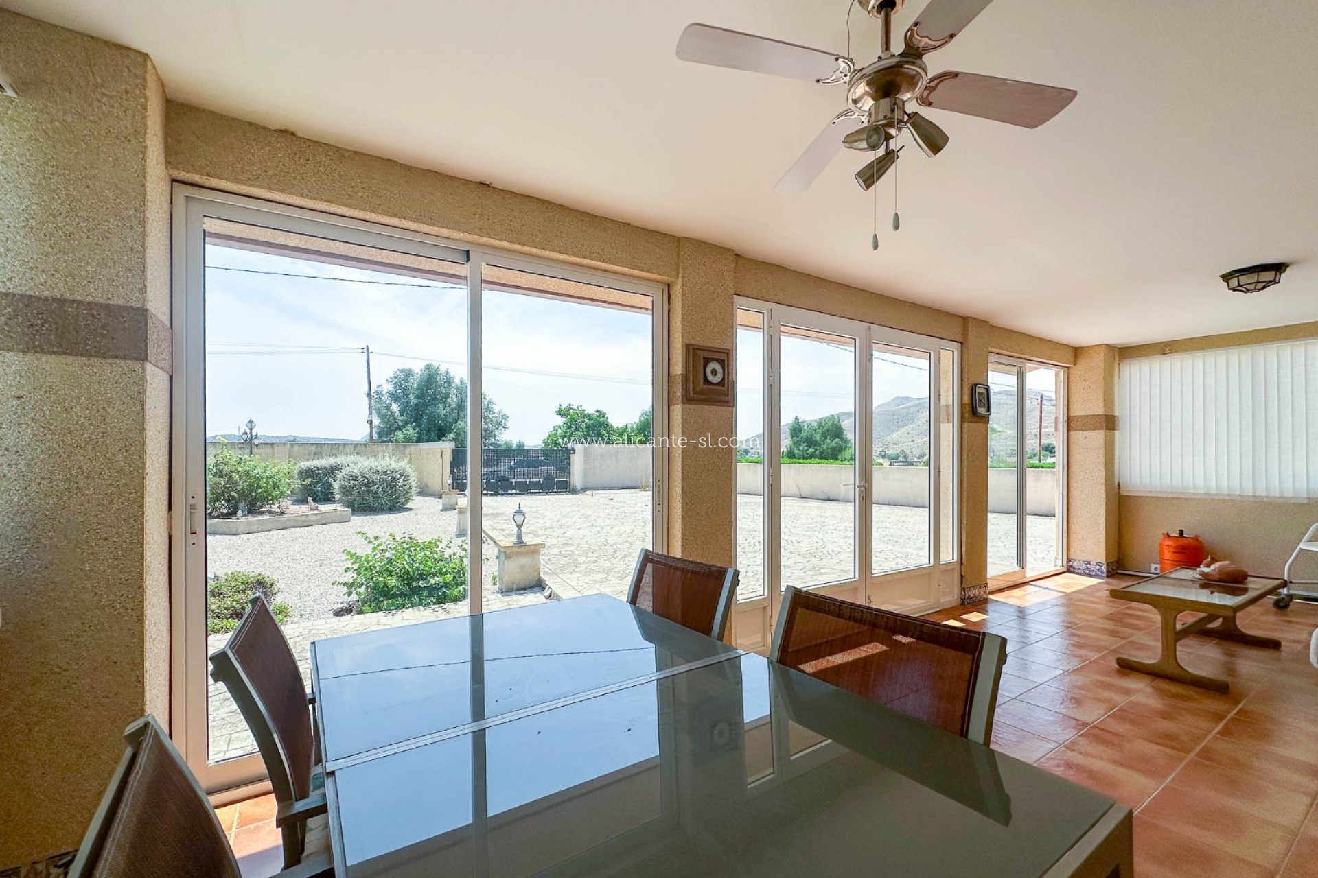 Esta espaciosa villa cuenta con un amplio salón-comedor con chimenea de leña, cocina totalmente equipada, 3 dormitorios dobles y 3 baños (2 en suite y 1 baño familiar). Dispone también de un gran recibidor abierto y un pequeño trastero en la parte trasera. Además, hay una terraza acristalada de buen tamaño en la parte delantera que ofrece vistas al jardín delantero y a las colinas del valle de Hondón.