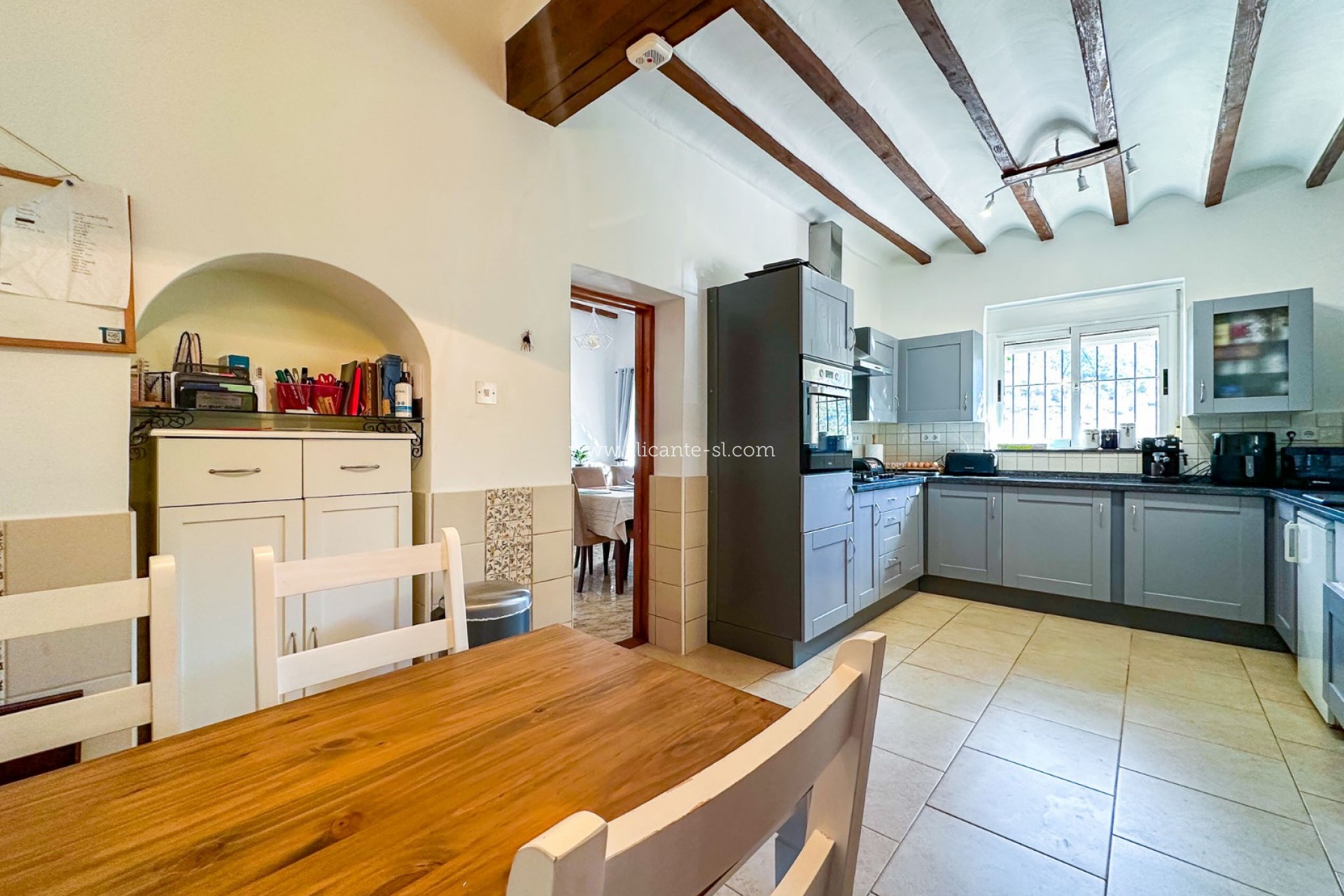 La vivienda está distribuida en 2 plantas. En la planta baja encontramos un amplio recibidor con techos altos y vigas de madera con mucho carácter. Hay un gran salón con estufa de leña, una amplia cocina de estilo rústico completamente equipada con zona de comedor, un comedor independiente, un dormitorio doble actualmente utilizado como gimnasio, una oficina que podría servir como un pequeño sexto dormitorio si se desea, un baño con ducha a ras de suelo y una terraza cubierta de 33m2 con arcos y vistas al jardín.