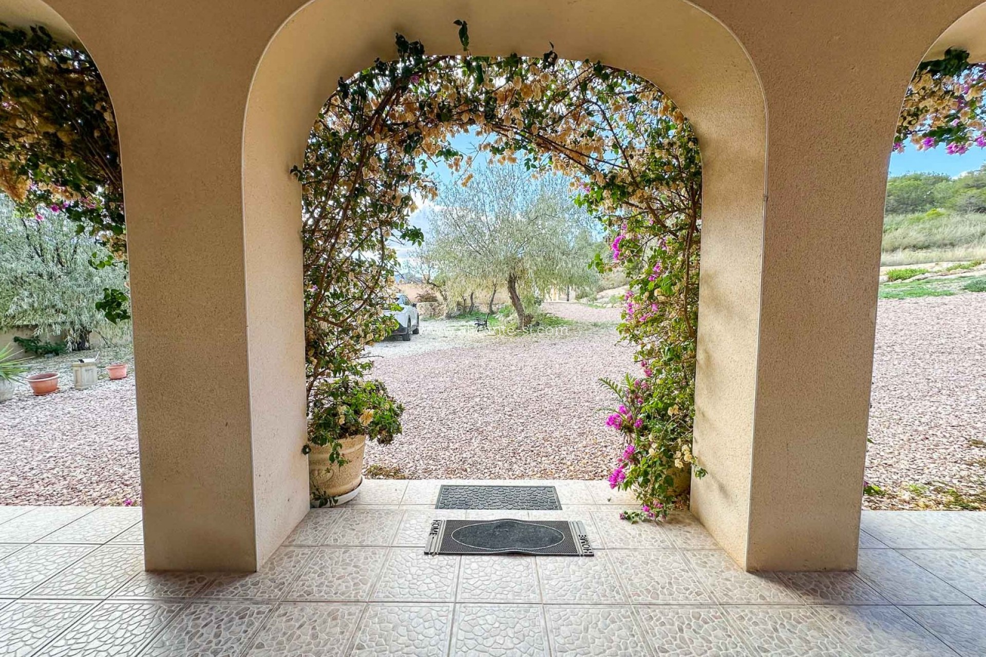 Los jardines cuentan con una gran variedad de plantas maduras, flores, arbustos y palmeras, con preciosas buganvillas rosadas rodeando la casa y los arcos de la terraza.