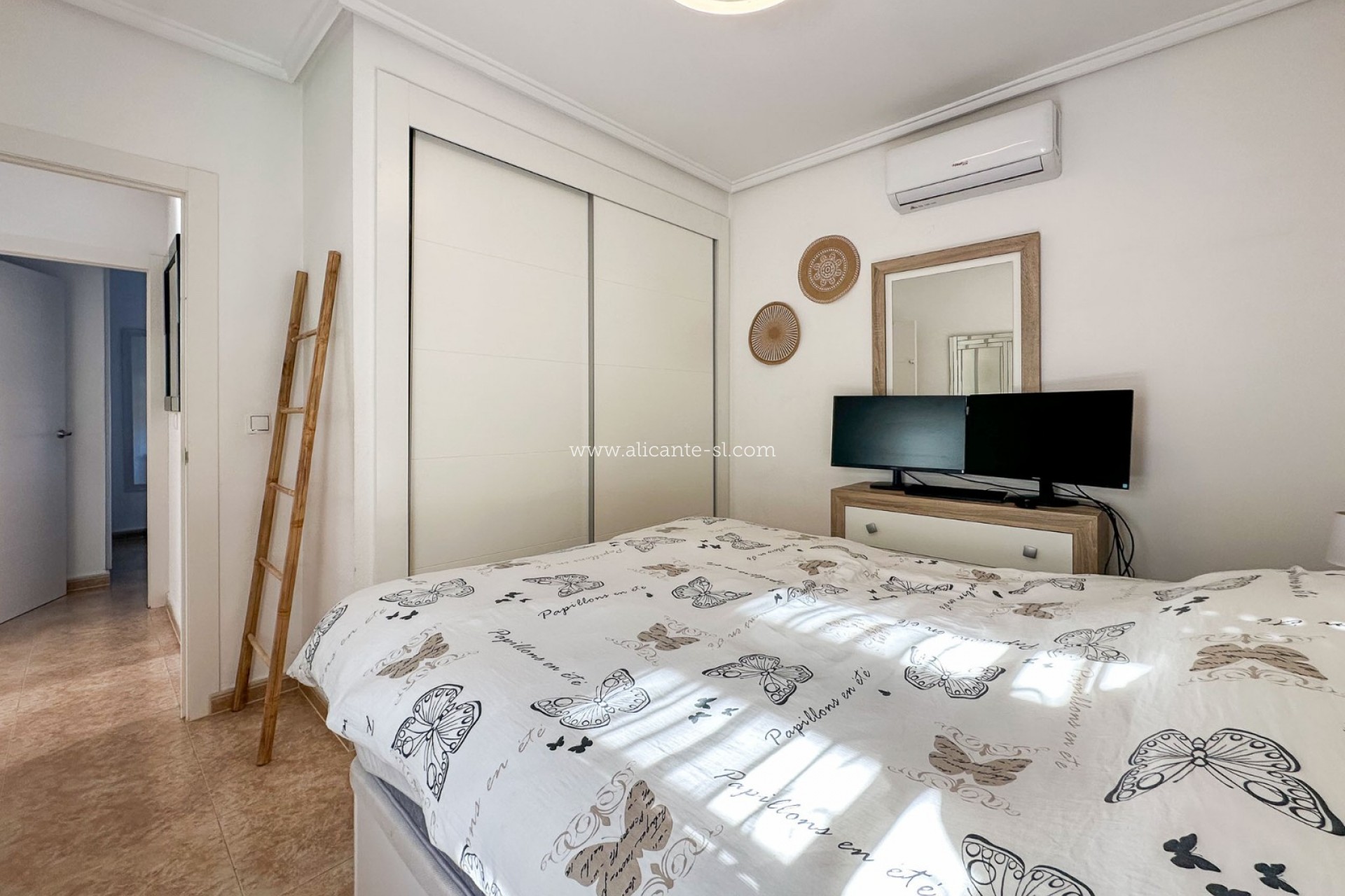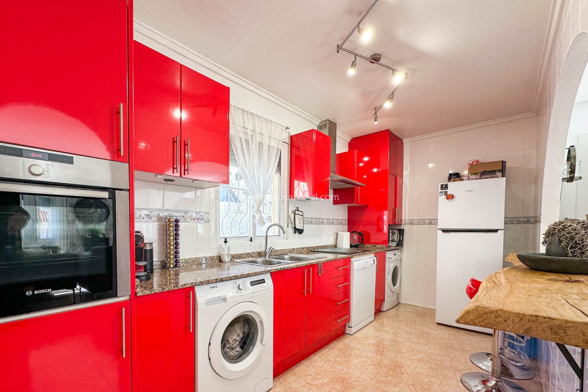 En el interior, la propiedad cuenta con tres dormitorios de buen tamaño y un baño moderno con ducha a ras de suelo. El amplio y contemporáneo salón destaca por su ventanal tipo bow window que llena el espacio de luz natural, creando un ambiente luminoso y acogedor. La cocina abierta, totalmente equipada, incluye una elegante barra americana y se integra perfectamente con la zona de estar, ideal tanto para el entretenimiento como para el día a día.