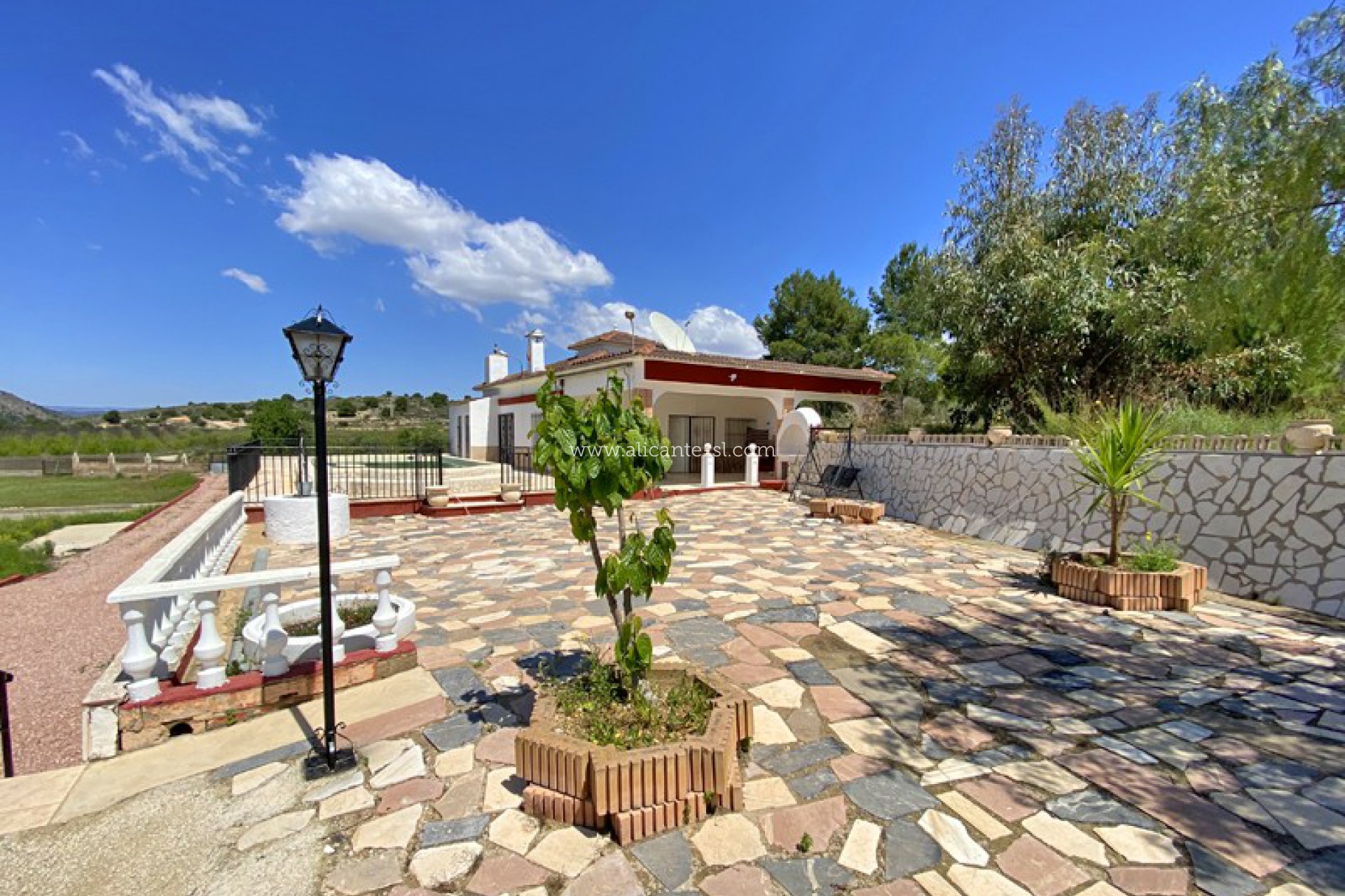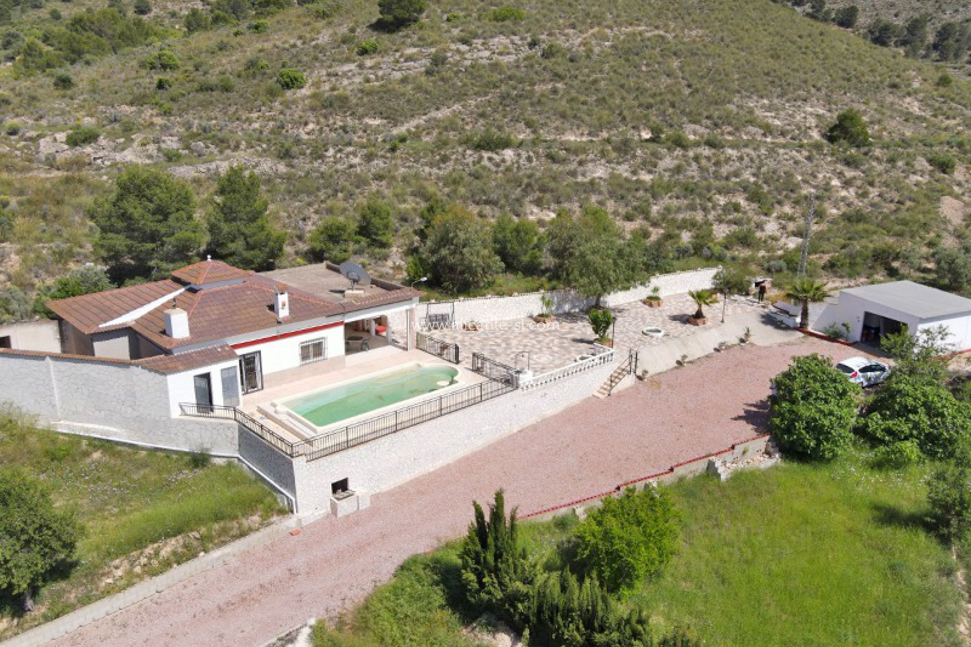 Het pand ligt op een groot perceel van meer dan 4000m2 met een scala aan volwassen planten en struiken en geniet van enkele van de beste uitzichten over de Hondon-vallei! Het pand is toegankelijk via een geasfalteerde weg met elektrische toegangspoorten en een onverharde oprit.