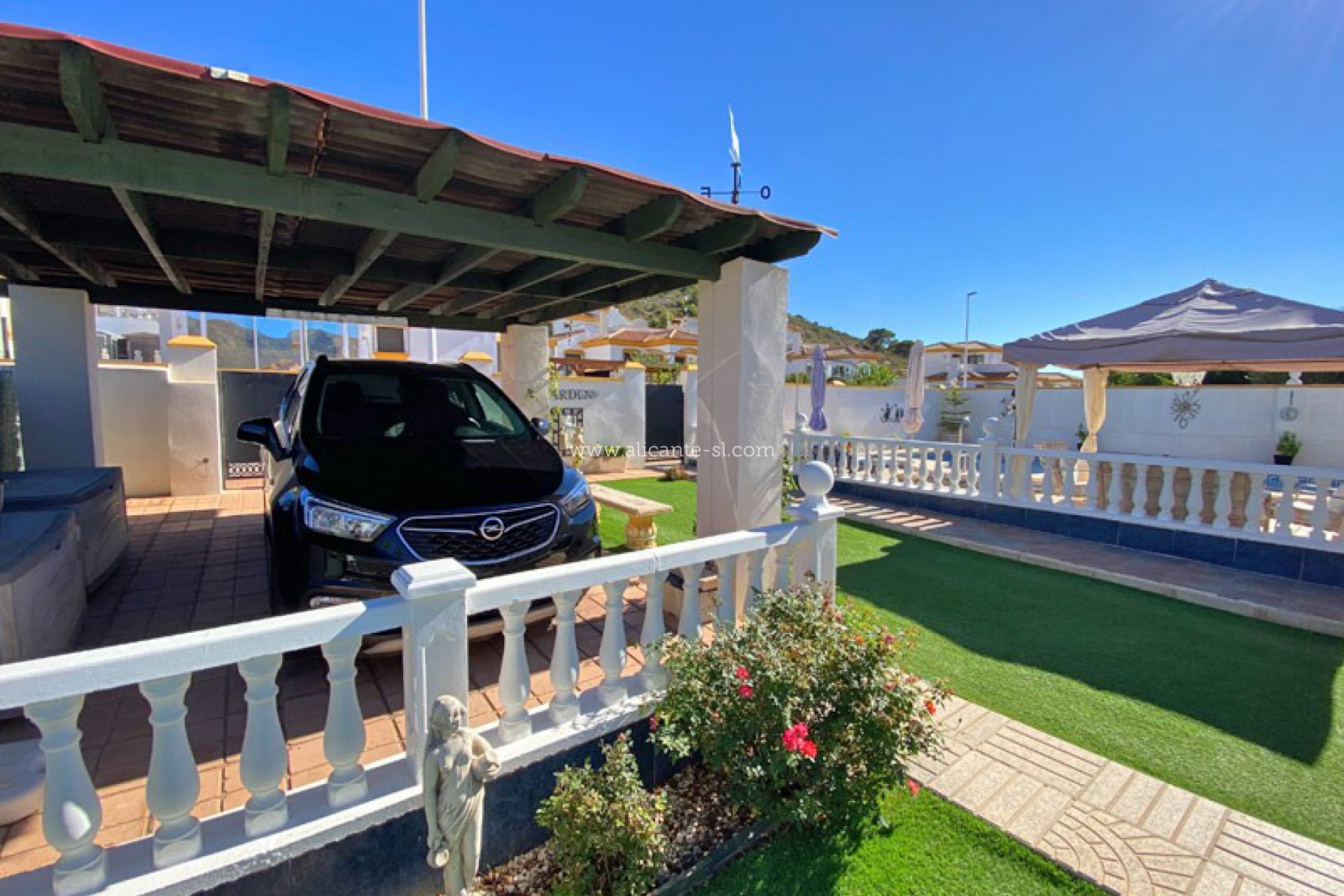 Outside, there is a good sized swimming pool with outside shower and sunbathing terrace. There is also vehicular access at the front of the property with a car port suitable for a large car and ample on street parking.