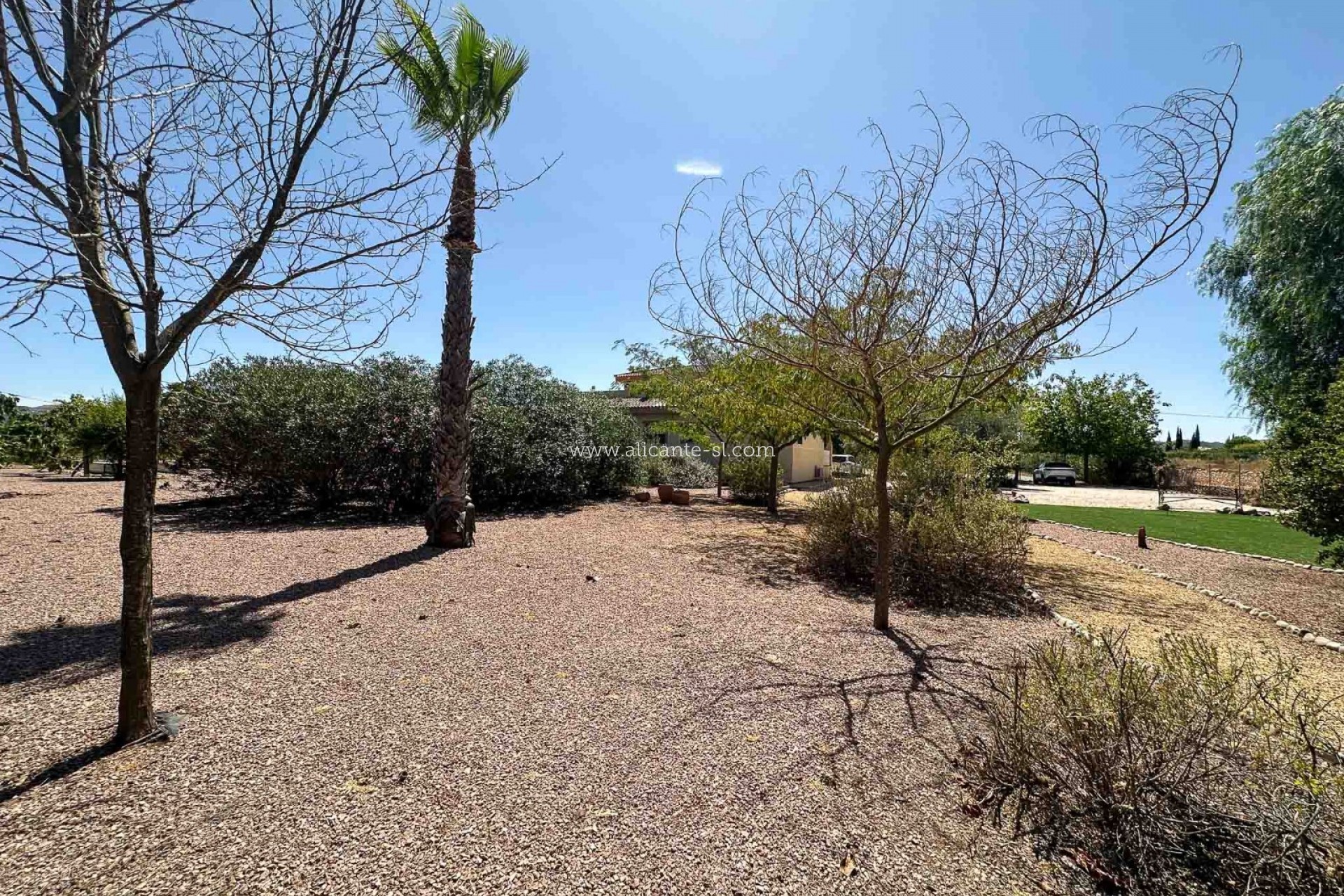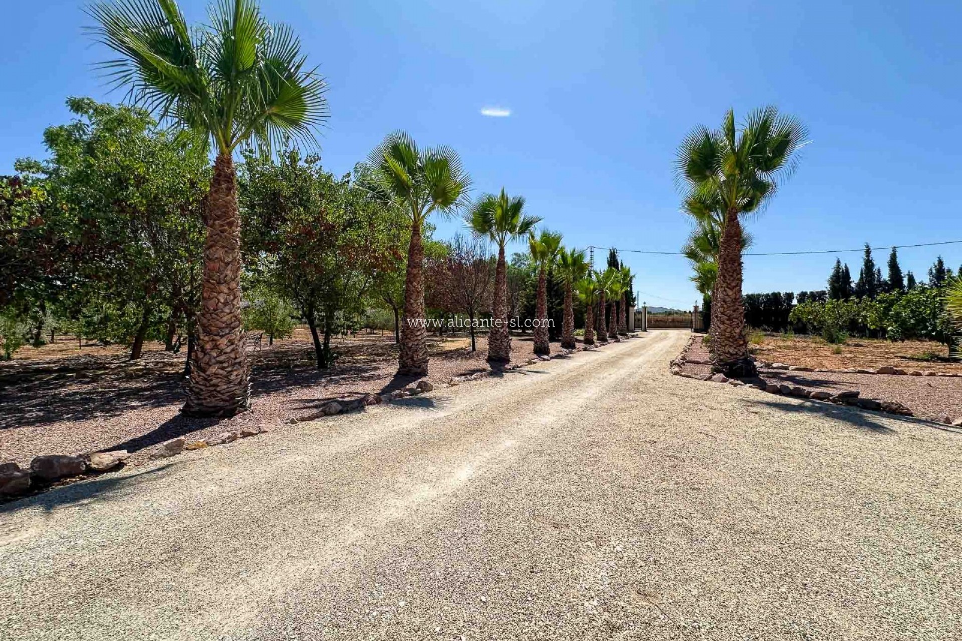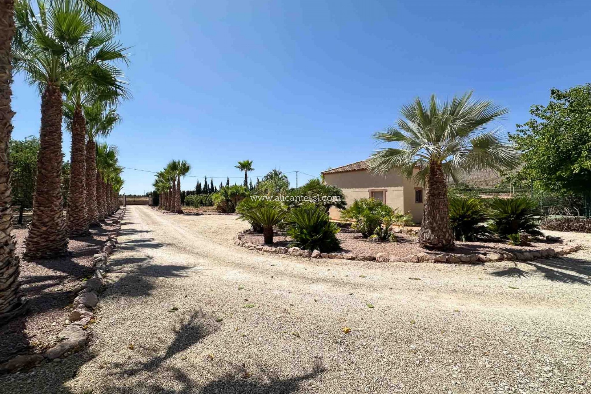 The villa sits proudly on a fully fenced plot of 14,400 m², accessed via electric entrance gates and a long palm-lined driveway leading to the parking area and garage. The garage provides secure storage for a large vehicle, or could easily be repurposed as a workshop or hobby space.