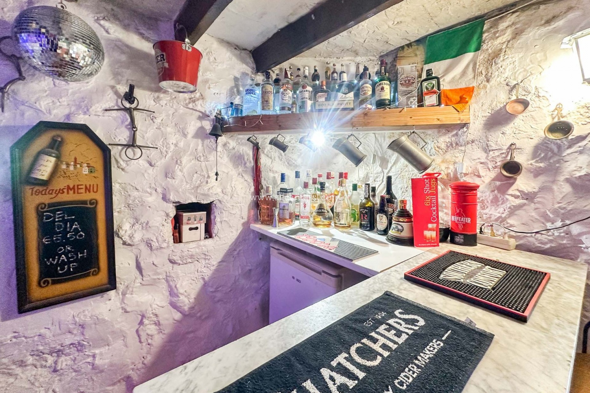 A glazed terrace area extends the living space further and leads through to the property’s own cosy bar, a charming and unexpected feature that provides the ideal setting for entertaining friends or enjoying relaxed evenings at home. In addition, to the side of the property is a good-sized garage and workshop, offering excellent storage or hobby space and presenting clear potential to be converted into a guest apartment, should additional accommodation be desired