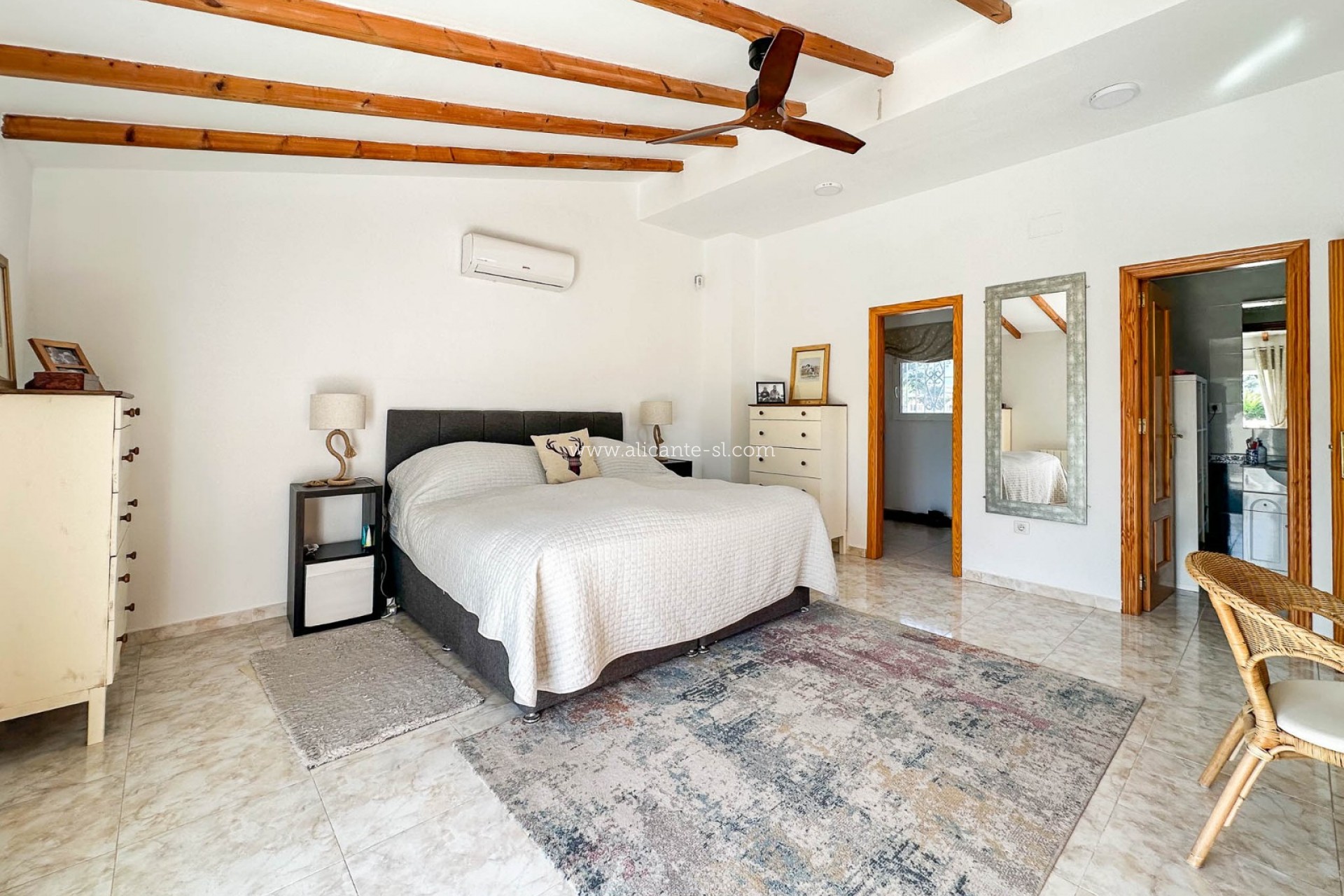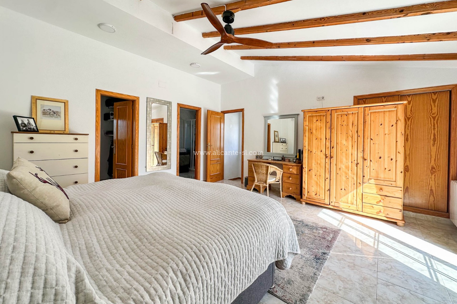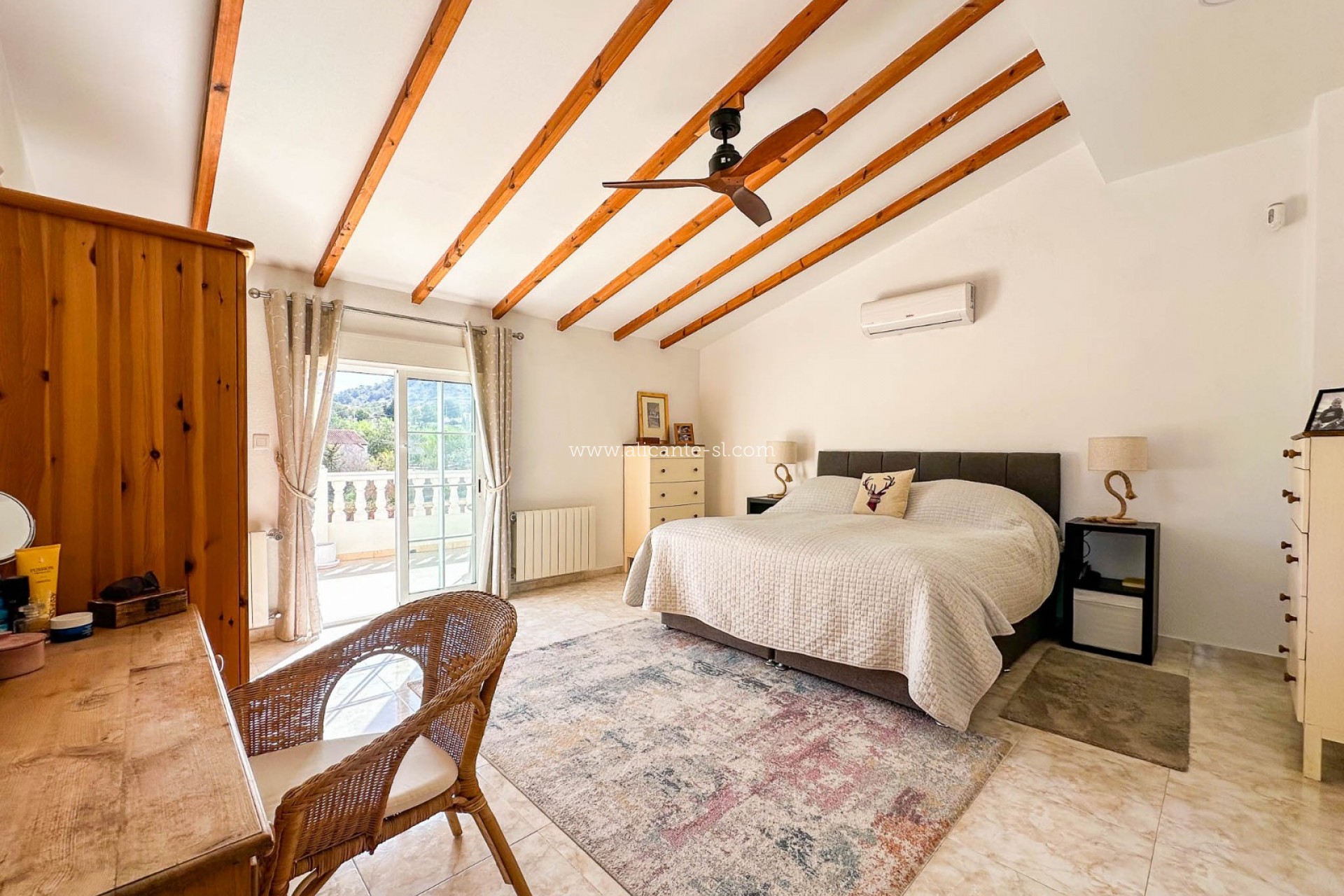 Upstairs, the master bedroom provides a true retreat. Featuring attractive wooden beams, a walk-in wardrobe and an en-suite bathroom, the room also benefits from its own private terrace where you can enjoy beautiful mountain views and complete tranquillity.
