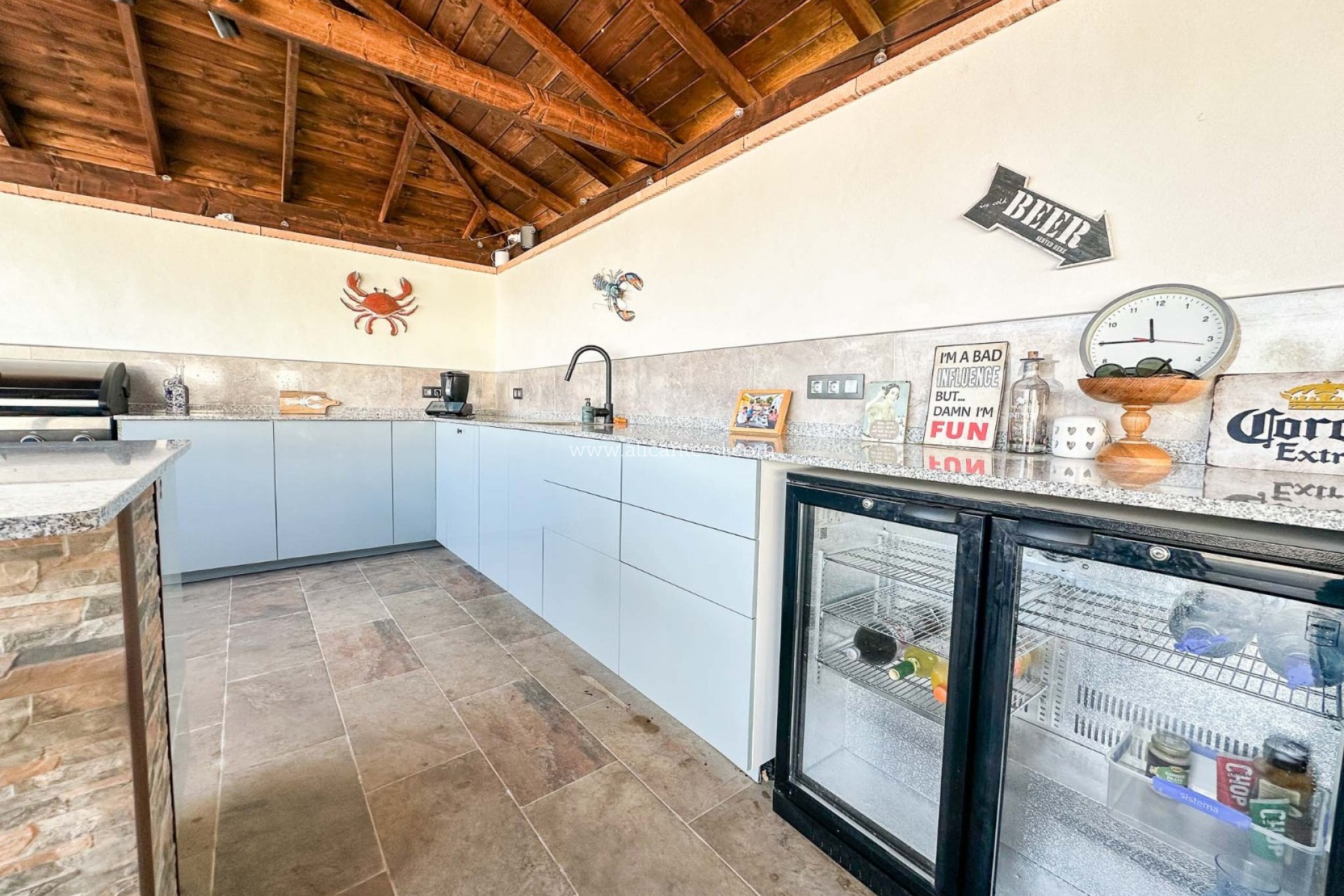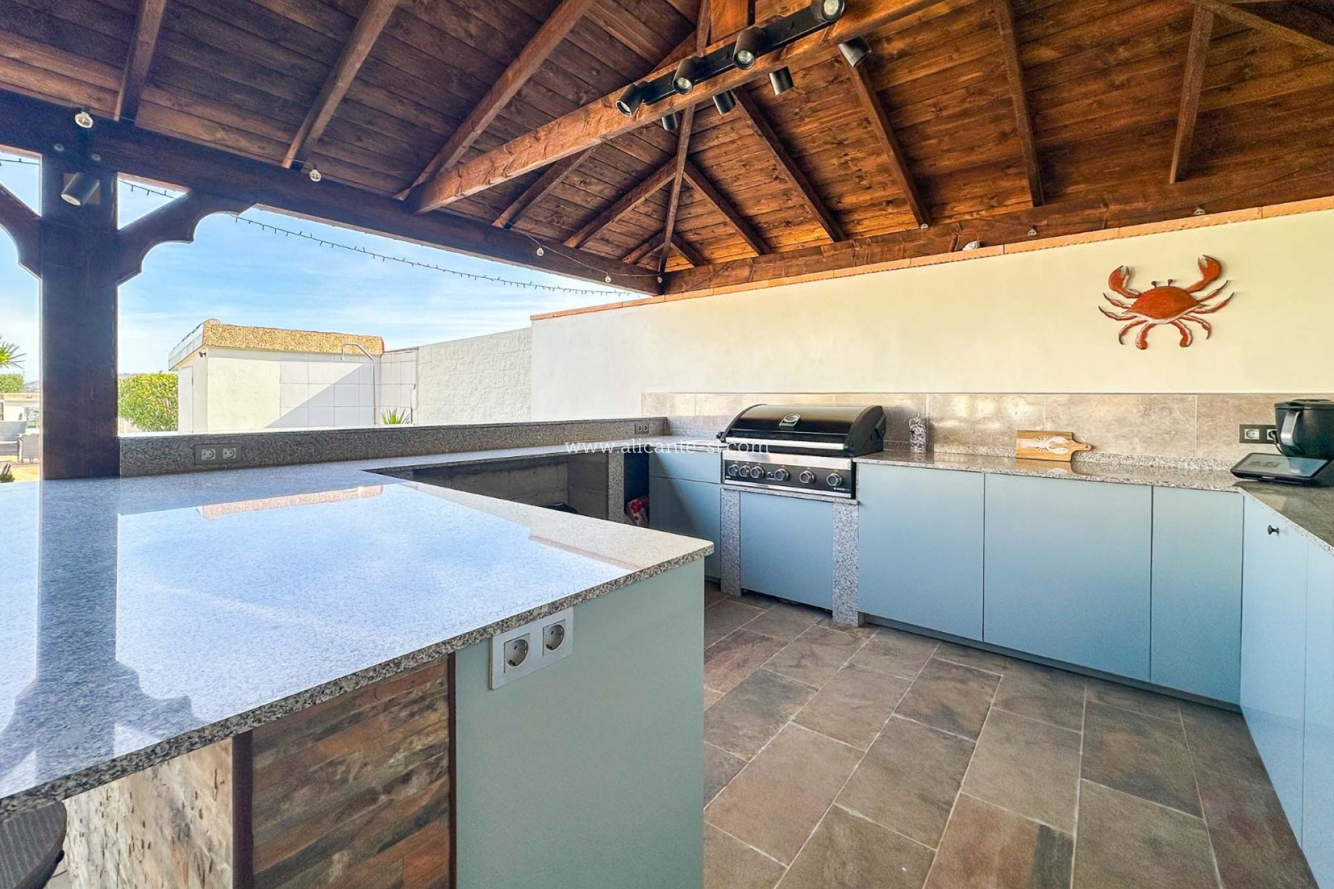 Outside, the property truly comes into its own. The impressive ten-metre swimming pool is surrounded by a large sun terrace, perfect for enjoying the Mediterranean climate. Adjacent to the pool is a superb summer kitchen and lounge area, fully equipped and ideal for entertaining friends and family. Whether hosting gatherings or simply relaxing in the sunshine, this space has been designed for outdoor living at its best. The property also benefits from a good-sized garage and a brick-built storage building for gardening equipment.